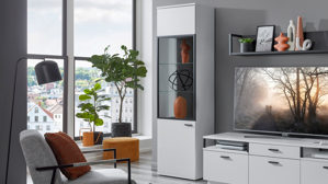 • Die Abbildung zeigt ein Wohnbeispiel, welches auch Dekoration sowie separat erhältliches Zubehör enthält. Im Lieferumfang enthalten ist eine Vitrine.