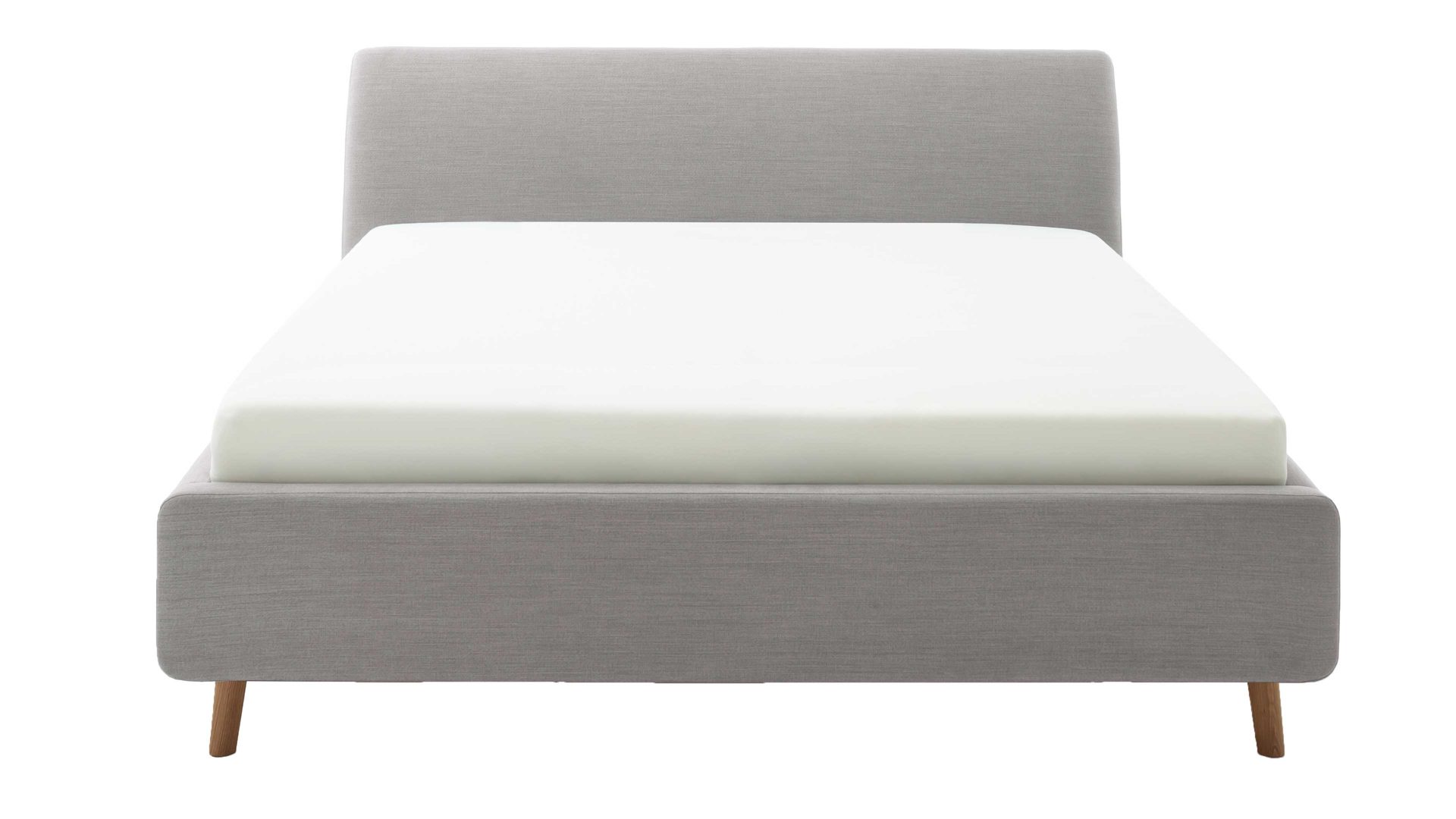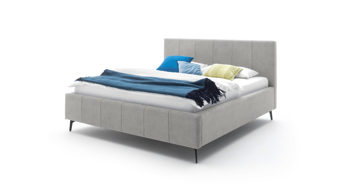 Pure Eleganz bringt das Polsterbettgestell Mila in Ihr Schlafzimmer. Die eichefarbenen Füße wirken filigran und verleihen diesem Modell eine luftig leichte Ausstrahlung. Ausgestattet ist das schicke Bett mit dem Bezug Capri 4150 aus hellgrauem Flachgewebe.