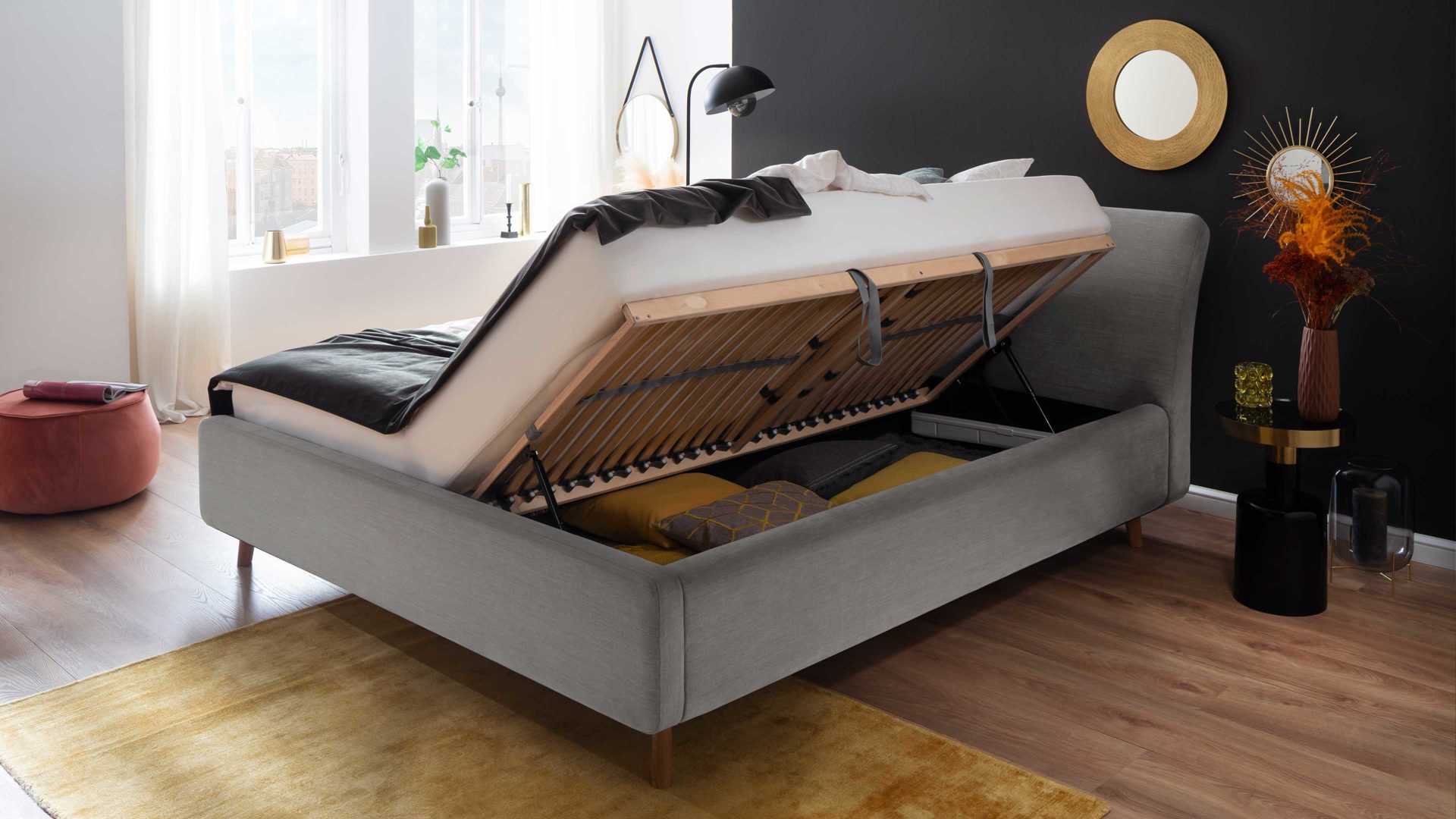 Polsterbettgestell Mila mit Bettkasten, glattes Kopfteil