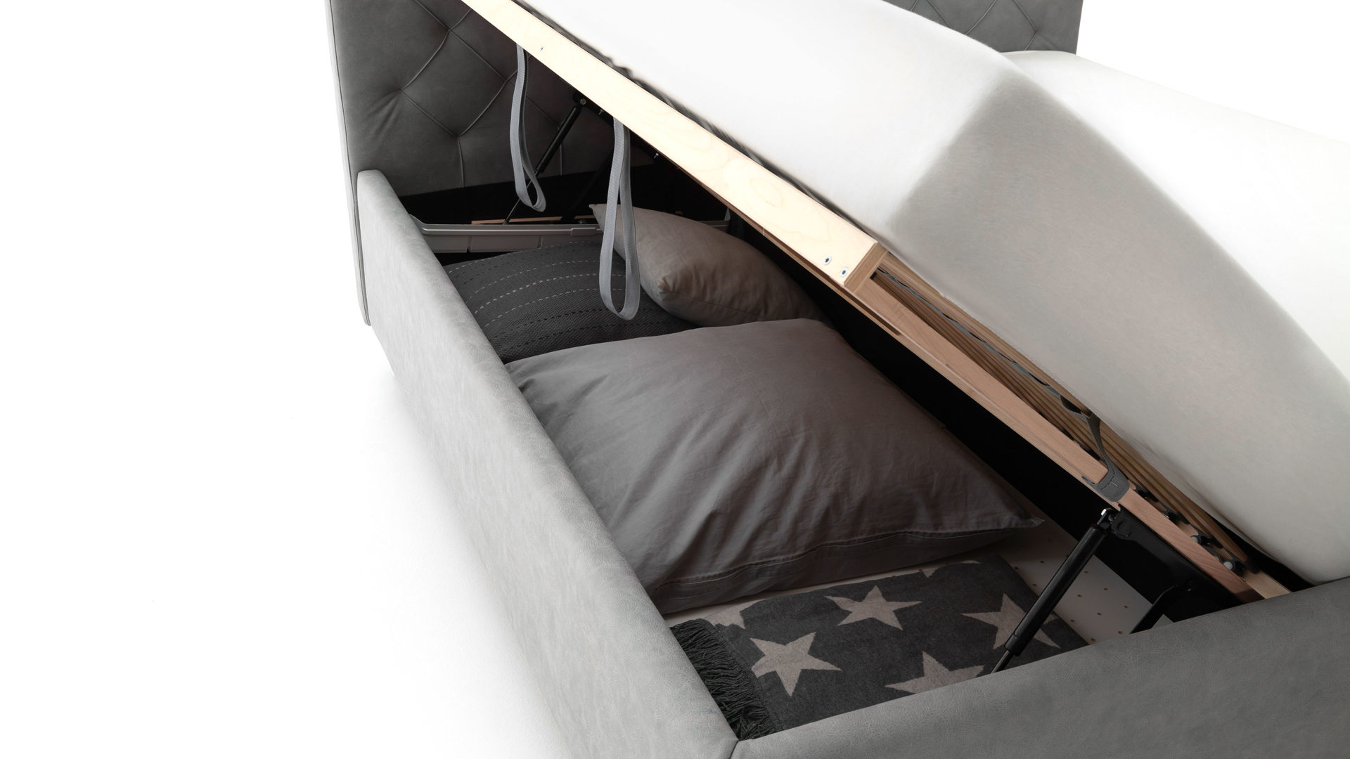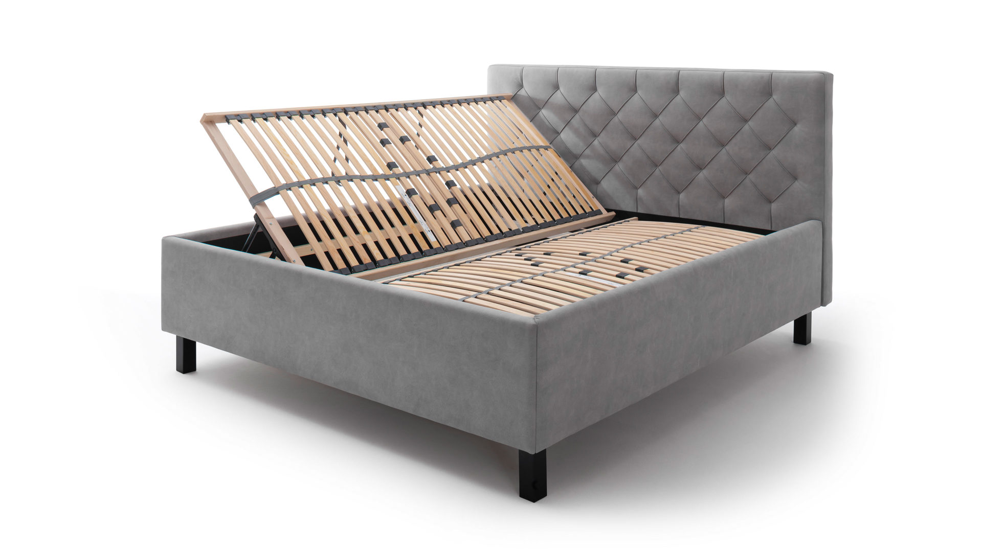 Mit einer Einlegetiefe von ca. 10 cm trägt das Bettgestell verschiedenste Arten von Matratzen. Diese finden auf einem Federholzrahmen aus 28 starren Leisten Platz. Dank der Härtegrad-Einstellung entscheiden Sie selbst, wie Sie am besten liegen. Unter dem seitlich zu öffnenden Rahmen befindet sich ein belüfteter Bettkasten für extra Stauraum.