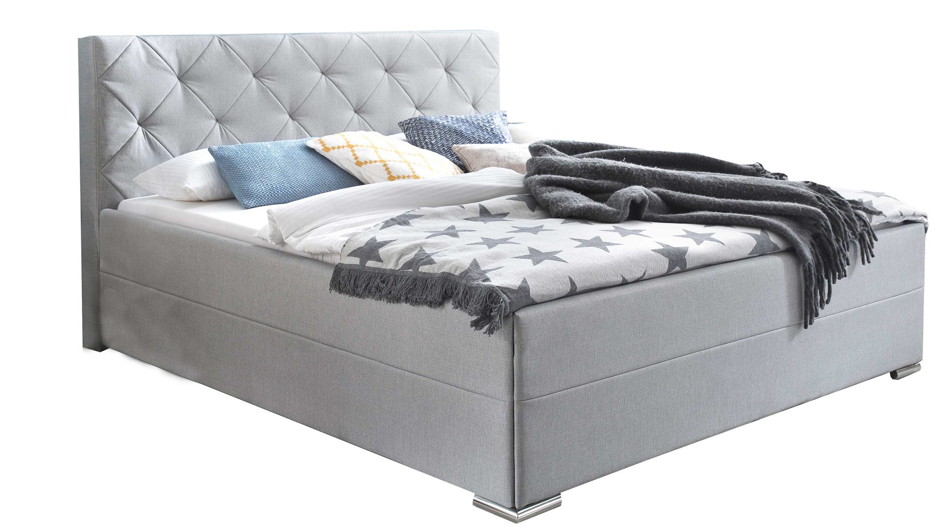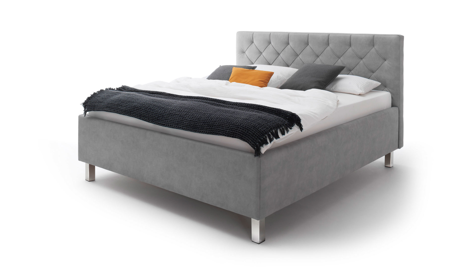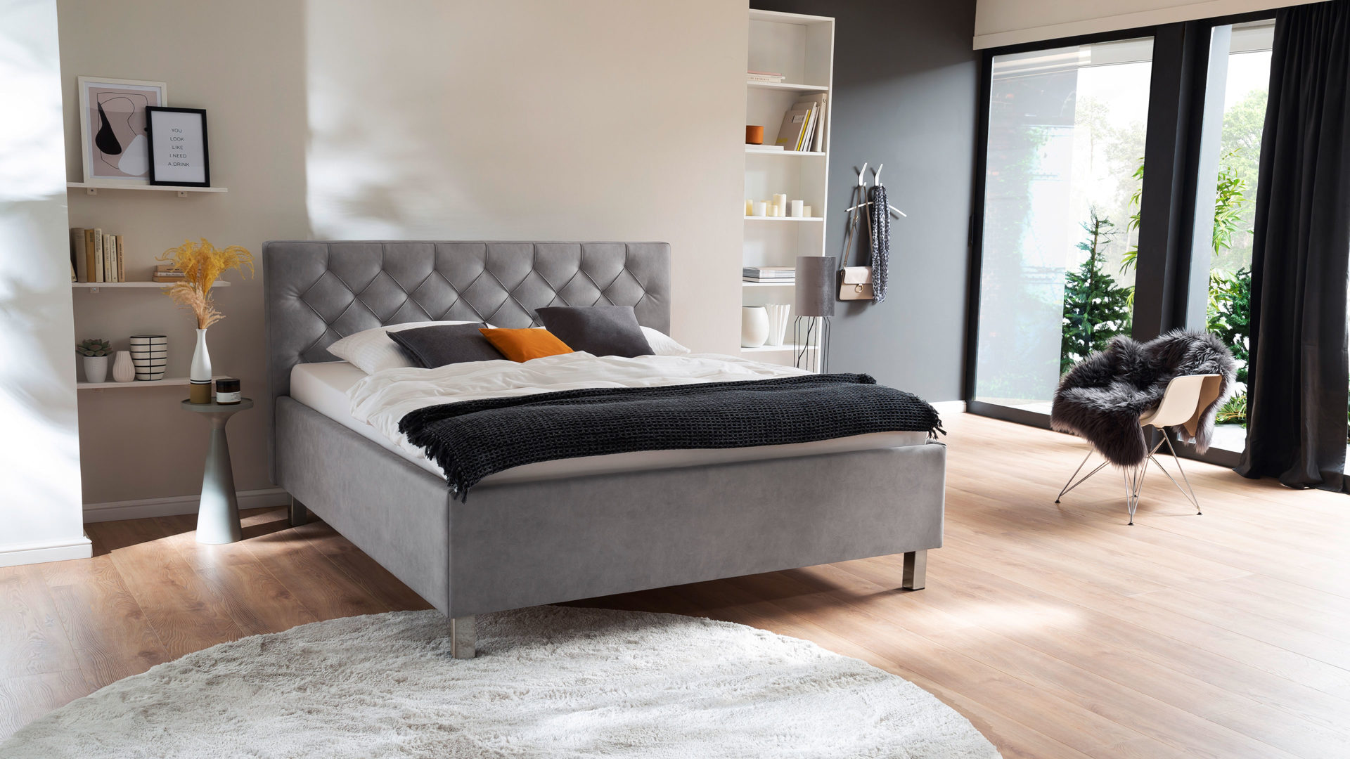 Das Polsterbettgestell San Remo bringt einen zeitlosen Chic mit. Sein hellgrauer Mikrofaserbezug Bulus 32 trifft auf Metallfüße in einem hellen Chrom-Ton. Abgerundet wird das edle Design von dem gesteppten Kopfteil mit Rautenmuster. Es entsteht ein stilvoller Look voll frischer Eleganz.