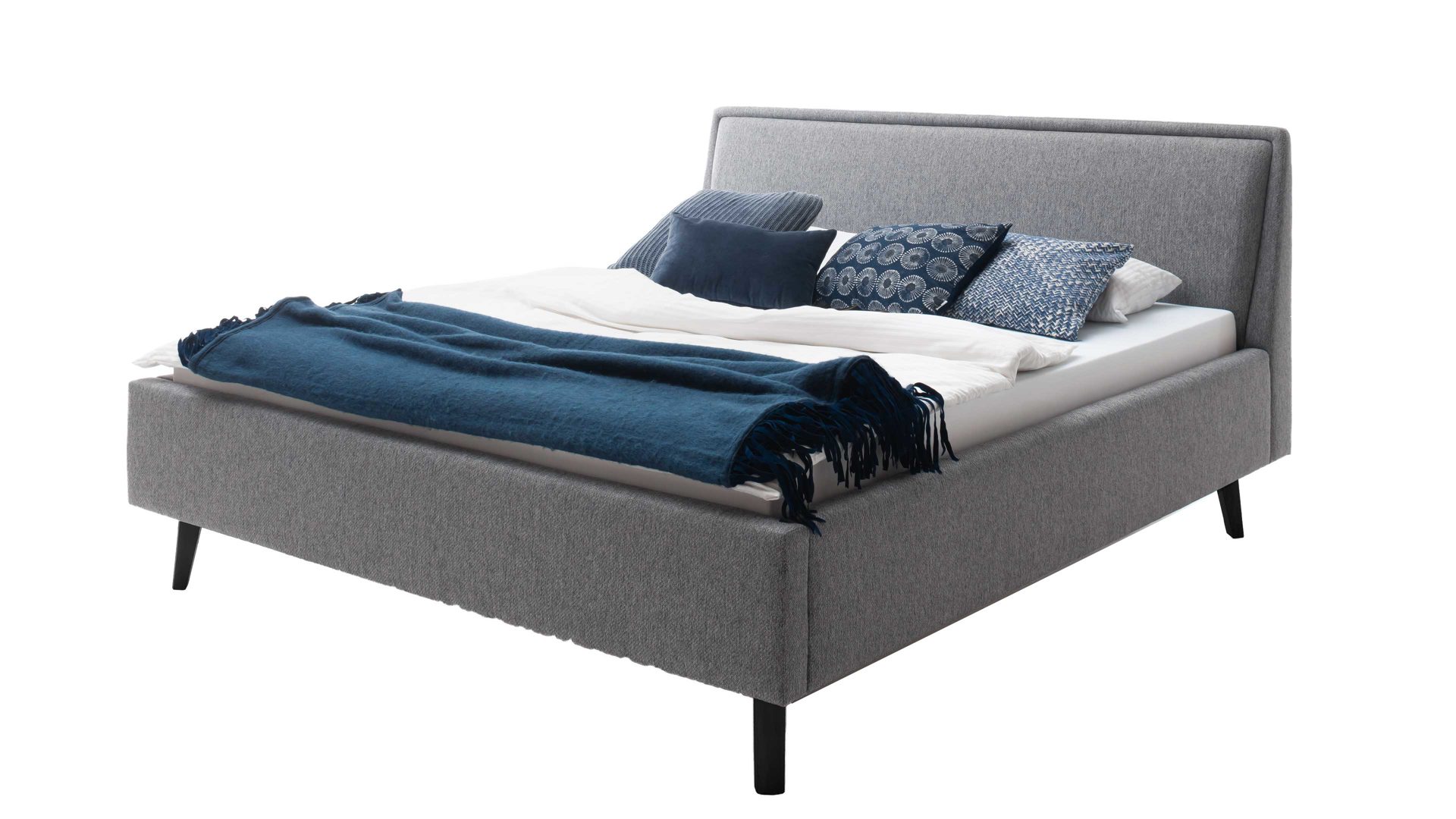 Das Polsterbettgestell Frieda mit Bettkasten verkörpert modernen Komfort. Mit dem grauen Stoffbezug und den schwarzen Holzfüßen präsentiert es sich elegant und gemütlich designt. Die Bettseiten sind genauso wie das Polsterkopfteil glatt bezogen. Letzteres ist eine angenehm weiche Rückenlehne, wenn Sie abends im Bett vor dem Schlafen noch entspannt in Ihrem Buch lesen oder fernsehen möchten.