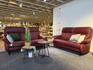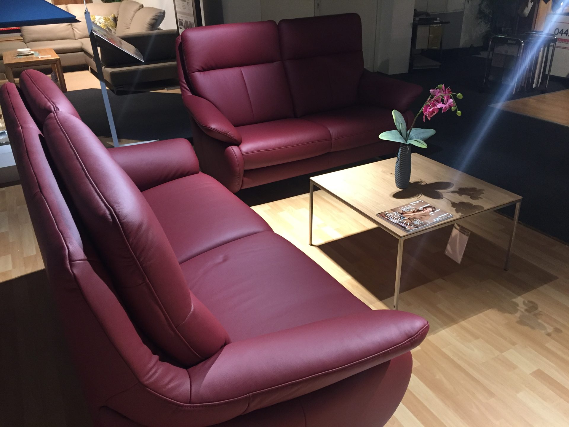 Die Polsterganritur in Bezug Leder Merlot alle Rücken Echt mit Fuss Kufe schwarz matt besteht aus