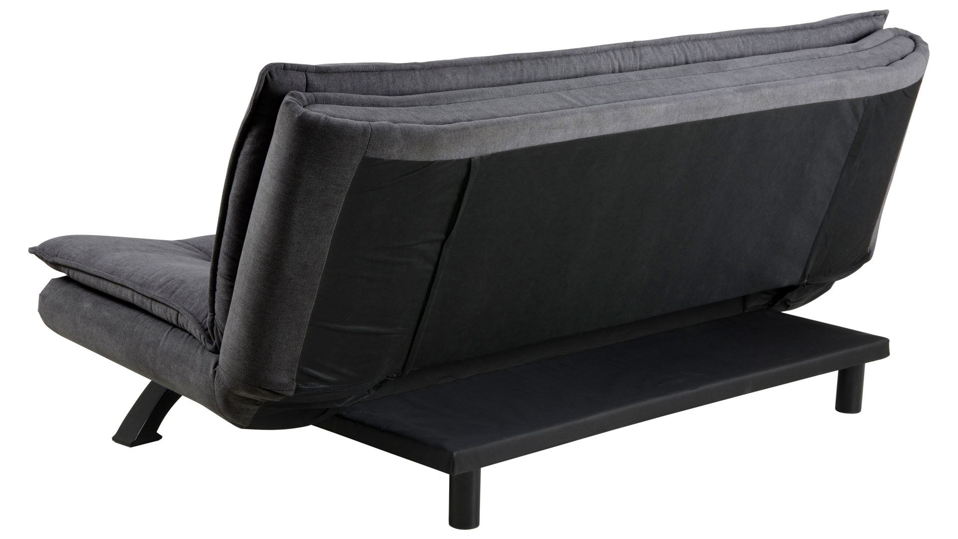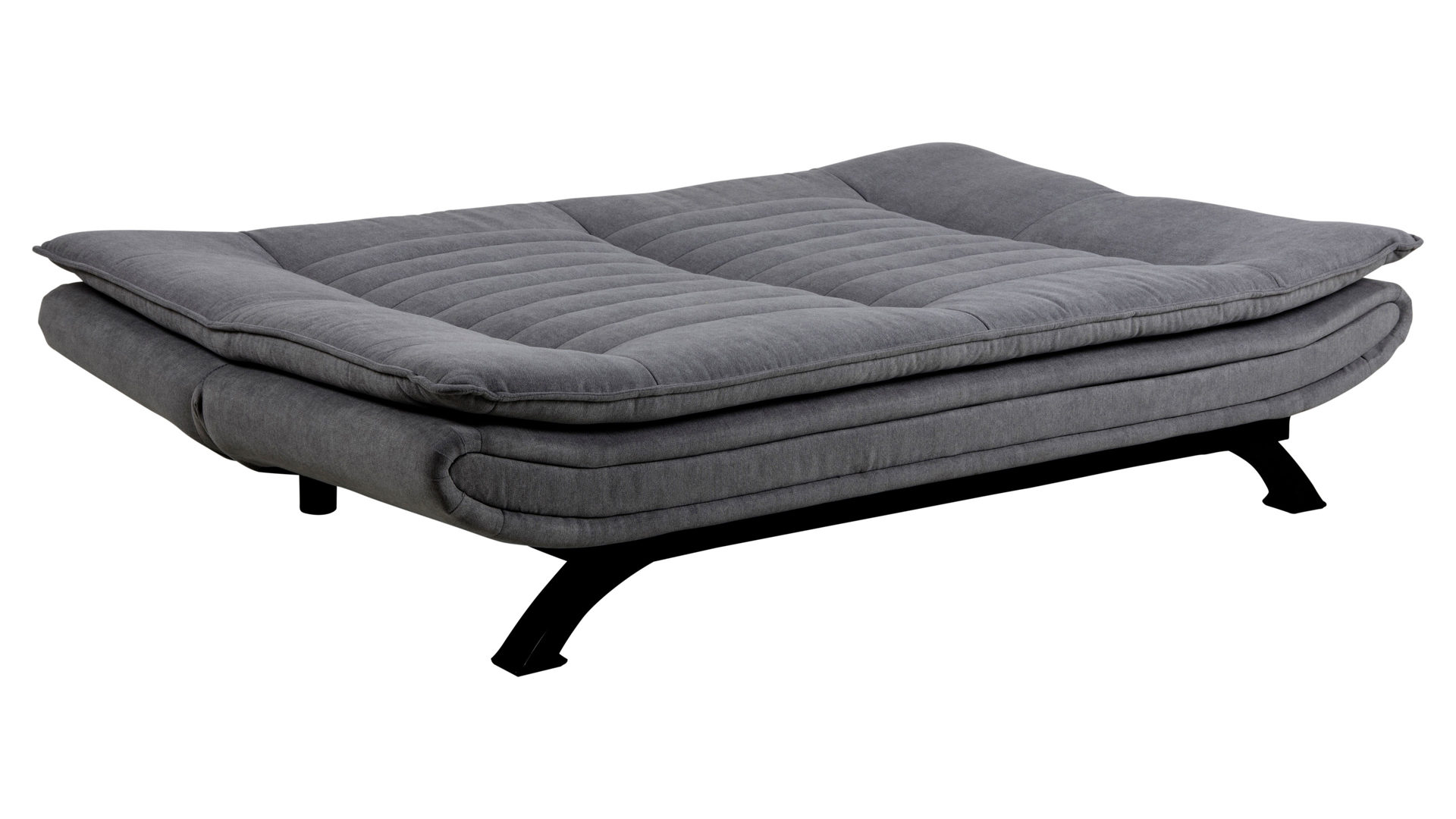 Dieses edle Schlafsofa mit weichem dunkelgrauen Stoffbezug und mattschwarz pulverbeschichteten Füßen lädt direkt zum Ausruhen, Schlafen und Träumen ein. Ungewöhnlich ist die futuristisch anmutende Form, die sehr reduziert und klar wirkt. Für Bequemlichkeit sorgen die üppigen Polster mit Steppnähten an Sitz- und Rückenfläche. Das Bettsofa bietet Sitzplatz für zwei Personen.