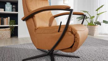 Das praktische Highlight des edlen Ledersessels bildet die manuelle Relaxfunktion: Indem Sie leichten Körperdruck anwenden, senkt sich der Rücken. Dabei geht der Sitz automatisch nach vorne und oben. Gleichzeitig fährt auch die Beinauflage nach oben, bis die Relaxposition erreicht ist.