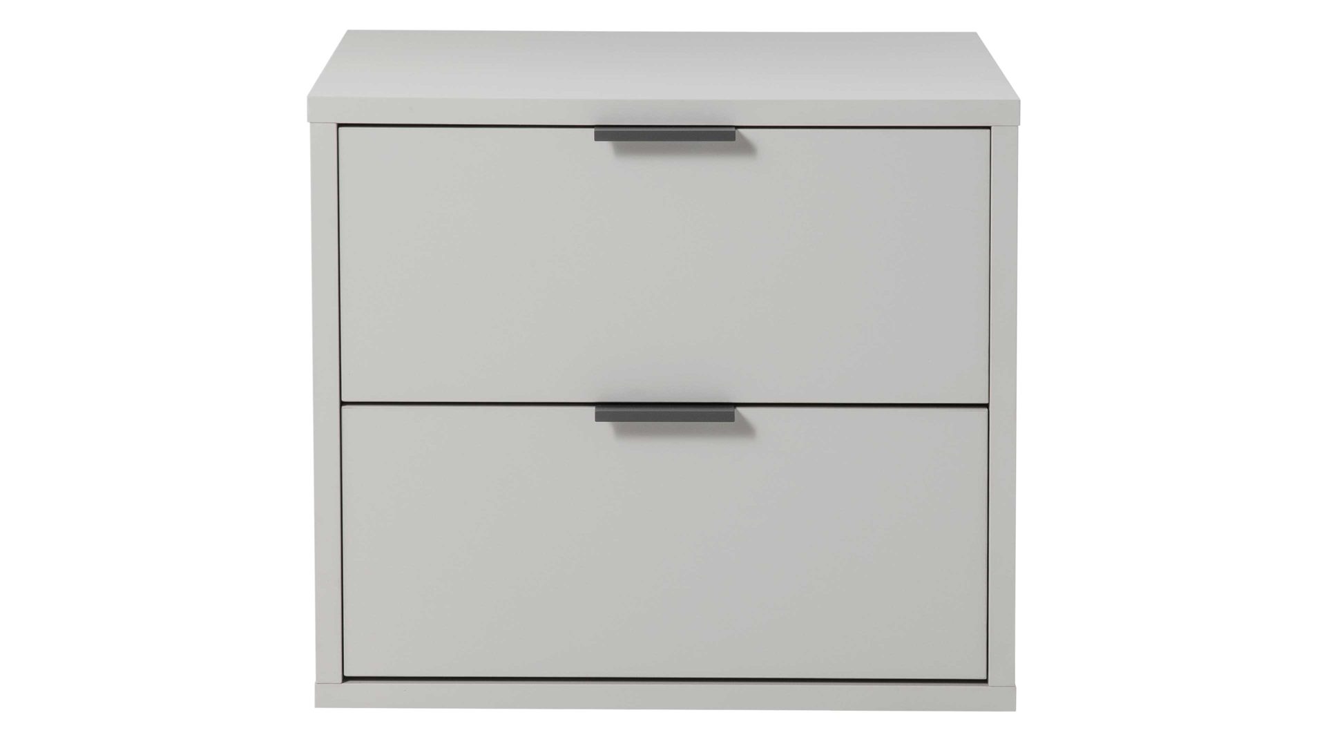Mit ihren kreidegrauen Mattlackoberflächen verkörpert die Nachtkommode Bonnie moderne Eleganz. Schwarze Metallgriffe und schlichte, praktisch höhenverstellbare Möbelgleiter runden das stilvolle Design harmonisch ab. Zu den qualitativen Höhepunkten gehören überdies die widerstandsfähigen abgerundeten Dickkanten.