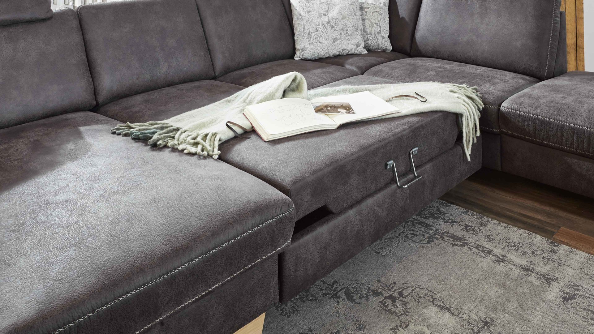 Mit dem stabilen Metallgriff ziehen Sie die Liegefläche unter der Sitzfläche hervor und bieten auf ca. 125 x 254 cm (BxL) einen gemütlichen Schlafplatz. Optional können Sie die Liegefläche im gleichen Stoff wie die Garnitur beziehen lassen.