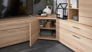 Das Lowboard mit Maßen von ca. 120 x 55 x 45 cm (B/LxHxT) ist mit zwei innen geteilten Schubladen ausgestattet und bietet großzügigen Platz für TV-Geräte bis 86 Zoll. Hier finden Technik, Zubehör oder Zeitschriften ihren Platz – ordentlich, übersichtlich und bequem zugänglich. Das Eckelement mit einer Tür und einem Holzboden misst ca. 77 x 55 x 77 cm (B/LxHxT) und verbindet die einzelnen Möbelteile harmonisch miteinander. Gleichzeitig nutzt es den vorhandenen Raum optimal aus – perfekt für kleine Ecken und Übergänge.