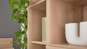 Die dreiteilige Aufsatzkombination setzt sich aus einem Regal mit vier Holzböden und Maßen von ca. 30 x 170 x 40 cm (B/LxHxT), einem zweitürigen Stauraumschrank mit offener Nische, drei Holzböden und Maßen von ca. 60 x 170 x 40 cm (B/LxHxT) sowie einm Regal mit fünf Holzböden und Maßen von ca. 30 x 216 x 40 cm (B/LxHxT) zusammen. Diese Kombination bietet reichlich Stauraum für Bücher, Deko oder Alltagsgegenstände – strukturiert, offen und optisch harmonisch abgestimmt.