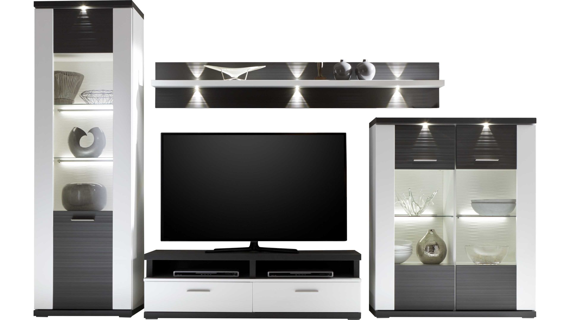 Tolle Wohnwandkombination für Ihr Zuhause: Mit arcticweißen Hochglanzfronten und graphitfarbenen geschroppten Absetzungen besticht diese raffinierte, fünfteilige Stauraumlösung als Wohnzimmermöbel. Die Korpusse verfügen über arcticweiße Melaminoberflächen, die nicht nur stoß- und kratzfest, sondern auch lichtbeständig sind. Die ca. 330 x 206 x 50 cm (BxHxT) große Wohnkombination besteht aus einer Vitrine mit Glastür, einem Wandboard, einem TV-Unterteil zwei Schubladen sowie einem zweitürigen Highboard, dessen Türen über Glaseinsätze verfügen. In diesen Aufbewahrungsmöbeln bringen Sie Gläser, Vasen, Bücher und Wohnaccessoires ordentlich und staubfrei unter. Ihren Fernseher platzieren Sie mittig auf dem Aufsatz des TV-Unterteils.