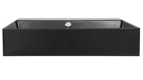 Der mattschwarze Keramik-Aufsatzwaschtisch mit Hahnlochbohrung und Überlauf ist widerstandsfähig und leicht zu reinigen. Maße: ca. 60 x 12 x 46 cm (B/LxHxT). Die passende Mischbatterie erhältst du gegen Mehrpreis.