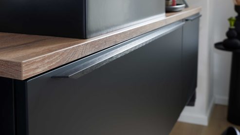 Der Waschtischunterschrank (Typ 2488) überzeugt mit supermatter schwarzer Lacklaminatfront, schwarzem Relinggriff (Typ 7945) und mattschwarzem Korpus. Ein großer Auszug mit Rückwand sorgt für Ordnung, für noch mehr Komfort ist die große Schublade mit Softclose und Selbsteinzug ausgestattet. Praktische Handtuchhalter kannst du gegen Mehrpreis ergänzen.