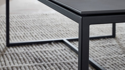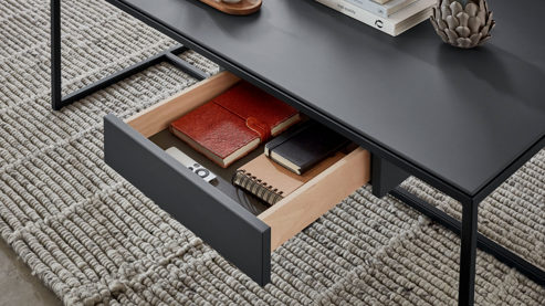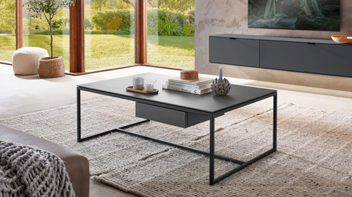 der Wohnzimmertisch ist in zwei Größen erhältlich und lässt sich optional mit einer Schublade ergänzen