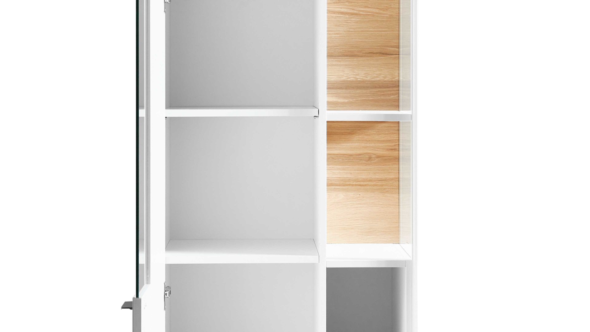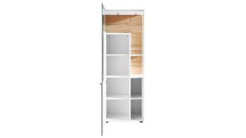 Hinter der links angeschlagenen Tür befinden sich drei verstellbare Holzböden, ein Konstruktionsboden sowie im verglasten Bereich ein kleiner fester Holzboden. Die Vitrine bietet auf insgesamt neun Abstellflächen praktischen und stilvollen Stauraum für Gegenstände, die Sie licht- und staubgeschützt aufbewahren oder gelungen in Szene setzen wollen. Ihre Maße betragen ca. 62 x 174 x 43 cm (BxHxT). Sie wird Ihnen bereits fertig montiert geliefert. Eine stimmungsvolle LED-Beleuchtung fungiert als optionales Zubehör.