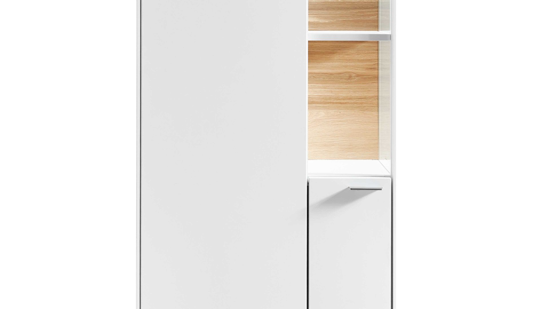 Die Vitrine aus dem VENJAKOB Wohnprogramm Sentino 3000 begeistert mit den Mattlackfronten und dem Korpus in Kristallweiß sowie der sichtbaren Rückwand, die ebenfalls matt kristallweiß lackiert ist. Auch die Aluleisten an den Korpusaußenseiten präsentieren sich in mattem Kristallweiß. Für das gewisse Etwas sorgen die Klarglaseinsätze. Klassisch weiße Korpusinnenseiten sowie der Griff in moderner Edelstahloptik runden den puristischen, eleganten Look harmonisch ab.