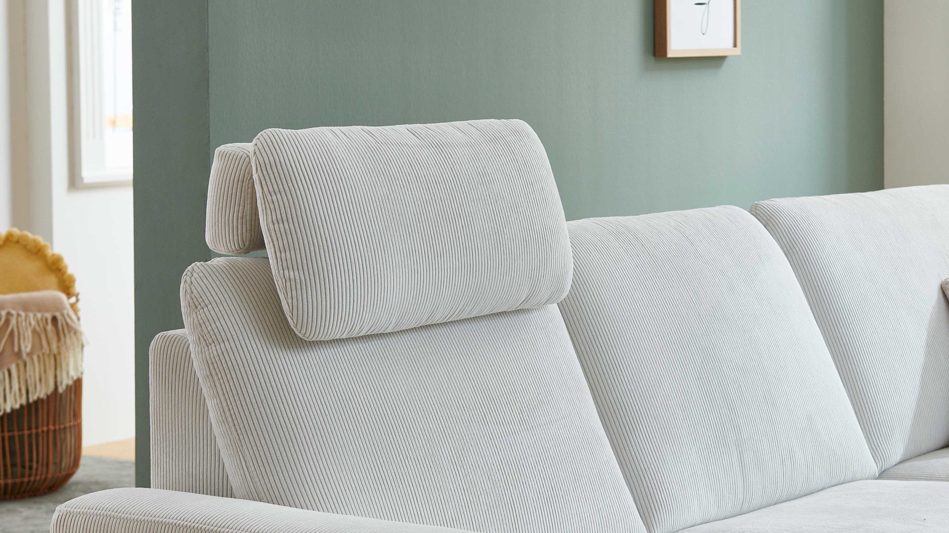 Sie lässt sich manuell in der Höhe und Neigung verstellen. Die mitgelieferte Kopfstützen-Vorrichtung aus robustem verchromten Metall ermöglicht die stufenlose Fixierung der Kopfstütze, deren Maße sich auf ca. 60 x 28 x 23 cm (BxHxT) belaufen. Mit dem naturweißen Feincordbezug harmoniert das Kopfpolster perfekt mit den Couches im gleichen Design.