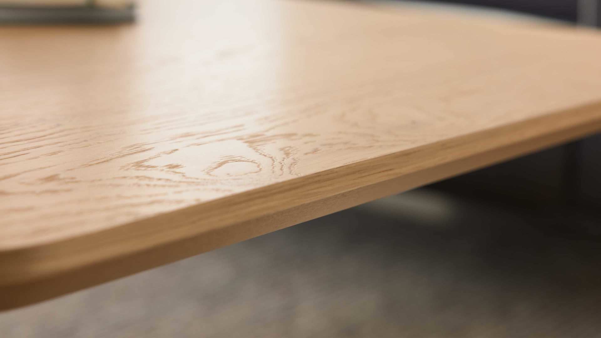Die Kombination aus natürlichem Wildeichefurnier, dunklen Akzenten und robusten Metallelementen in Anthrazit-Metallic sorgt für eine harmonische Balance zwischen Wohnlichkeit und modernem Design. Die feine Maserung der Tischplatte verleiht dem Tisch Tiefe und Wärme, während die klaren Linien und das formstabile Untergestell ein Gefühl von Leichtigkeit vermitteln.