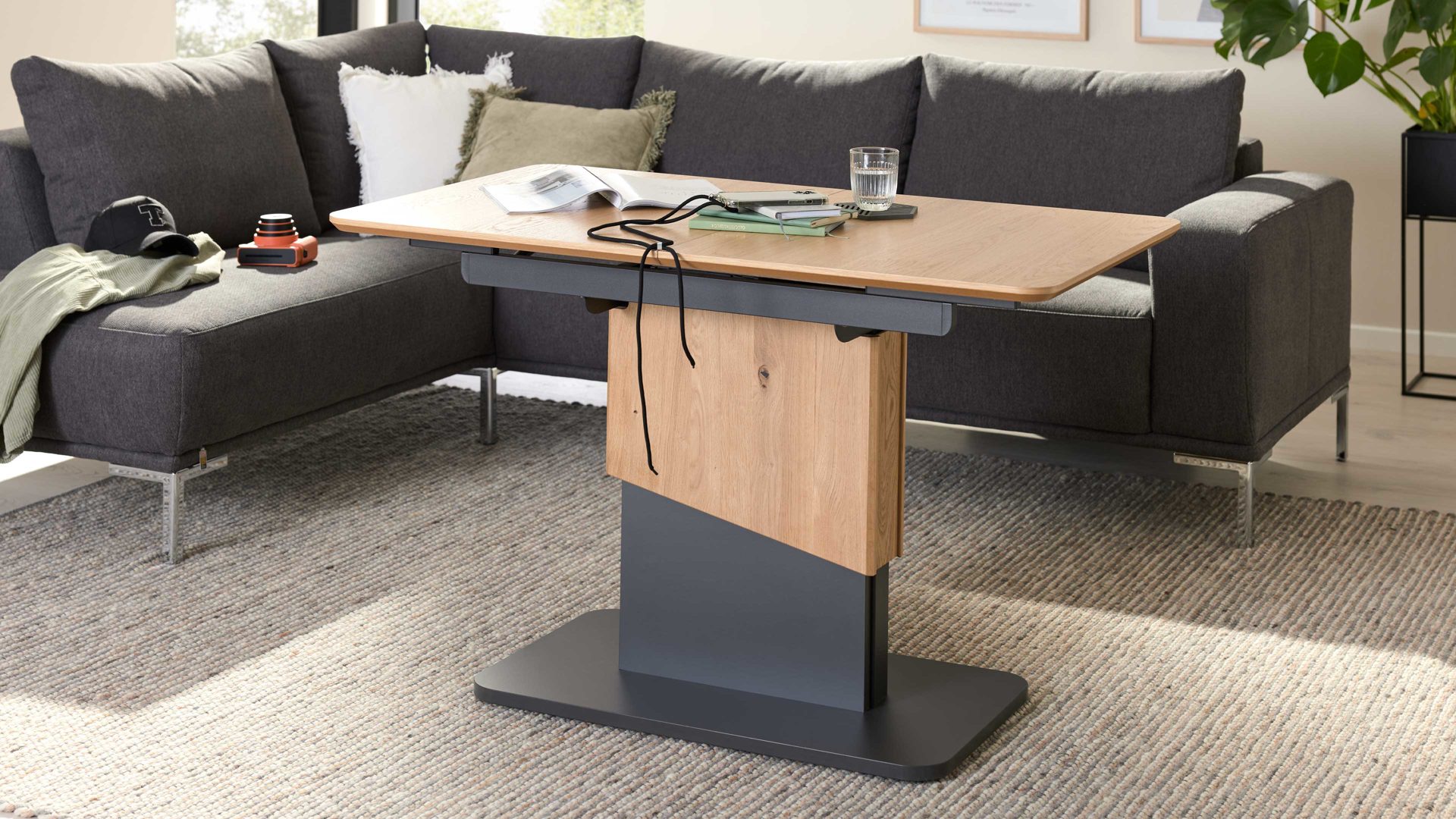 Dieser Couchtisch begeistert mit cleverer Technik: Dank Tornado-Auszug lässt sich die Tischplatte ganz einfach von ca. 120 cm auf 160 cm verlängern – ideal, wenn du spontan mehr Platz benötigst. Zusätzlich bietet die Liftfunktion eine stufenlose Höhenverstellung von ca. 54 bis 73 cm, sodass du den Tisch im Handumdrehen vom Couchtisch zum Esstisch umfunktionieren kannst.