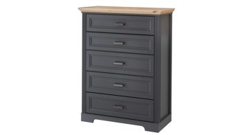 Die attraktive Schubladenkommode ist Teil einer umfangreichen Kommodenserie, die verschiedene Türen-, Schubladen und Kombikommoden in diesem stilvollen Landhaus-Look umfasst. Statt in tiefgründigem Graphit sind die Schränke auch in heller Pinie erhältlich. Alle Kommoden des ansprechenden Programms lassen sich einfach montieren.