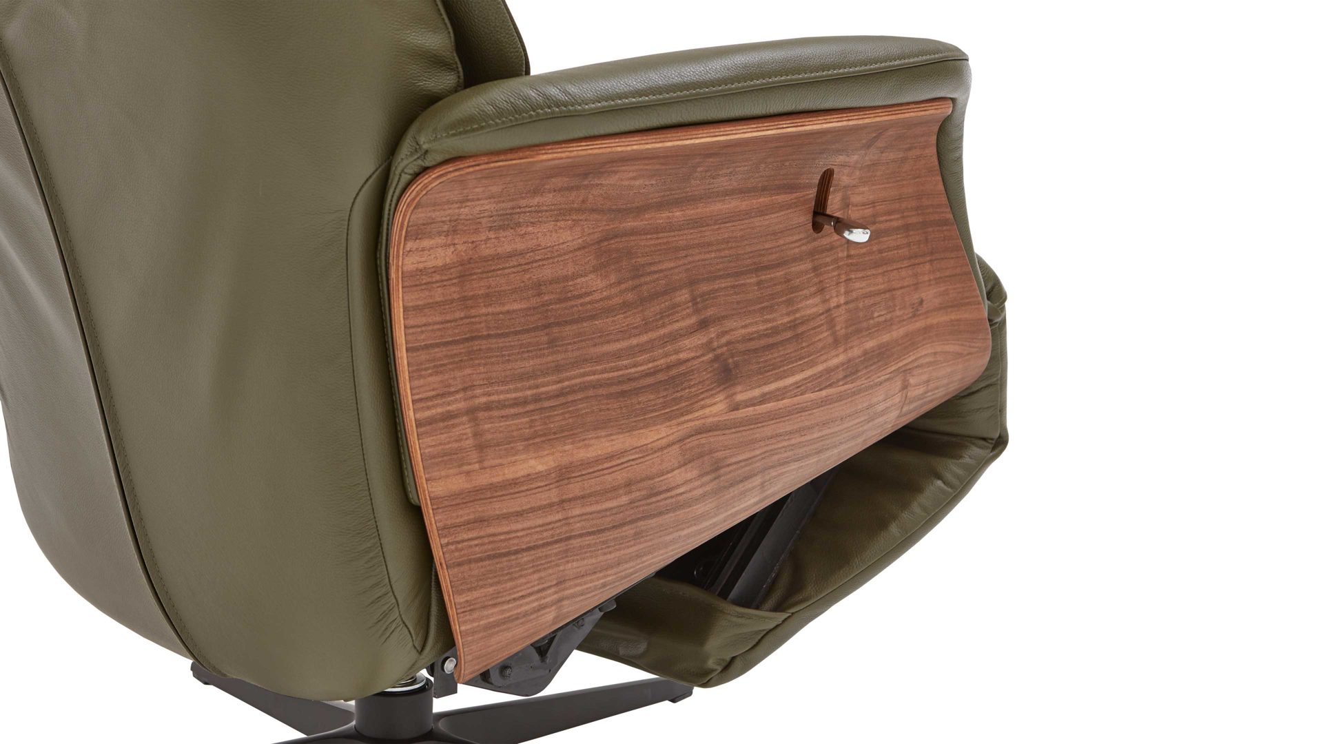 Sie sind auf der Suche nach einem schönen und sehr bequemen Sessel? Dann ist dieser Relaxsessel bzw. Drehsessel mit einem strapazierfähigen dunkelgrünem Lederbezug, der Sitzschale in geöltem Nussbaum und einem modernen Sternfuß aus schwarzem Metall genau das richtige Sitzmöbel für Sie. Nutzen Sie die manuell verstellbare Relaxfunktion und stellen Sie den Ledersessel so ein, dass Sie komfortabel lesen und fernsehen können.