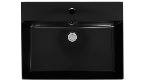Der mattschwarze Keramik-Aufsatzwaschtisch mit Hahnlochbohrung und Überlauf ist widerstandsfähig und leicht zu reinigen. Maße: ca. 60 x 12 x 46 cm (B/LxHxT). Die passende Mischbatterie erhältst du gegen Mehrpreis.