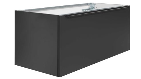 Der Waschtischunterschrank (Typ 2488) überzeugt mit supermatter schwarzer Lacklaminatfront, schwarzem Relinggriff (Typ 7945) und mattschwarzem Korpus. Ein großer Auszug mit Rückwand sorgt für Ordnung, für noch mehr Komfort ist die große Schublade mit Softclose und Selbsteinzug ausgestattet. Praktische Handtuchhalter kannst du gegen Mehrpreis ergänzen.