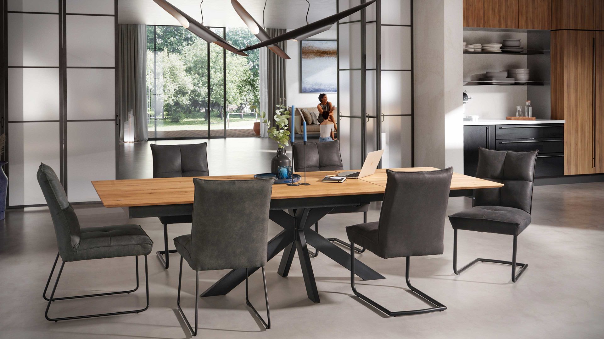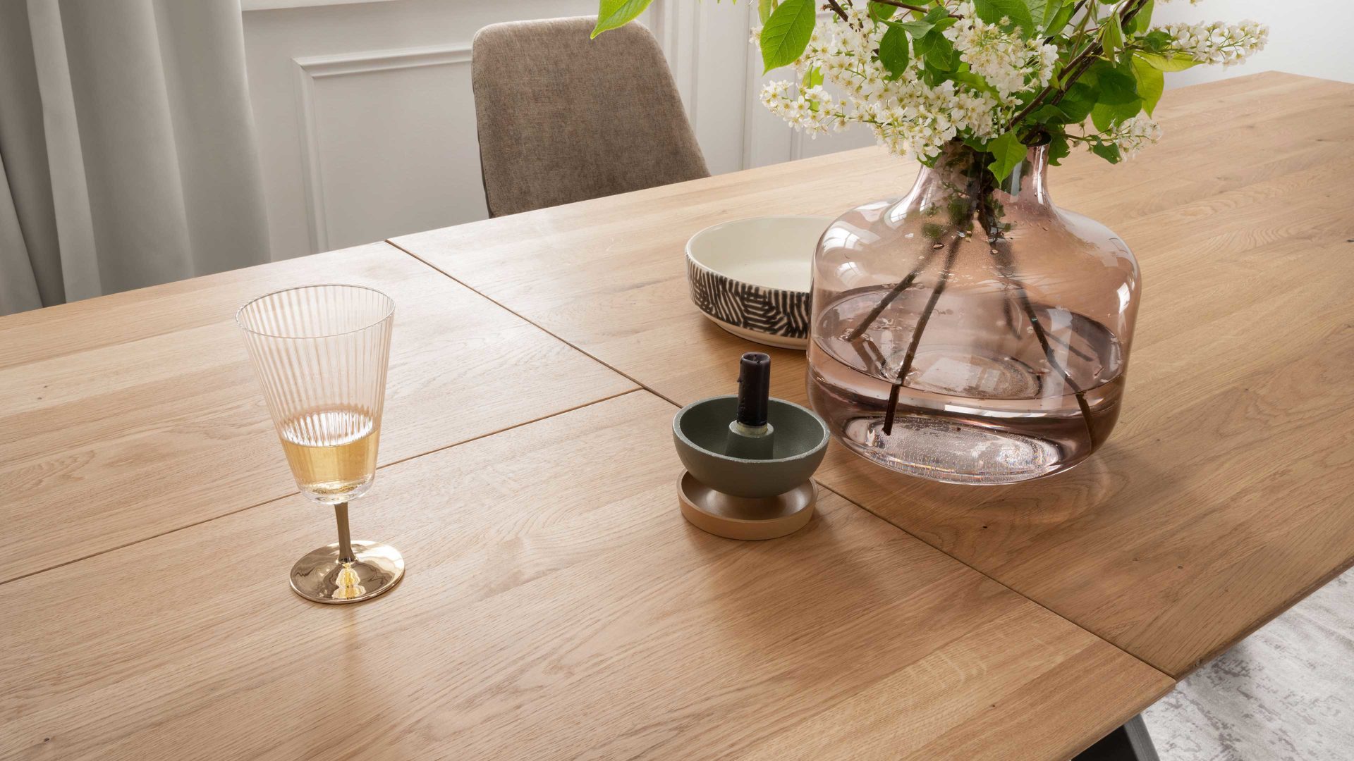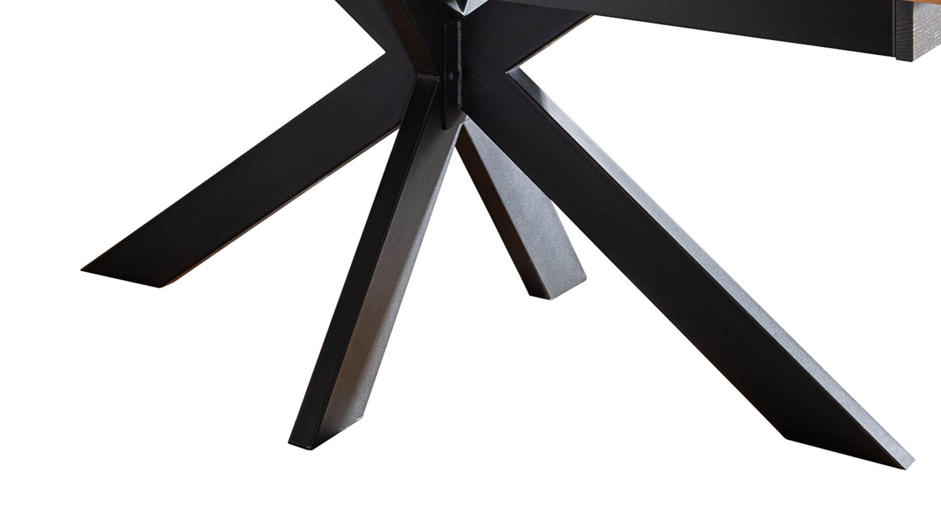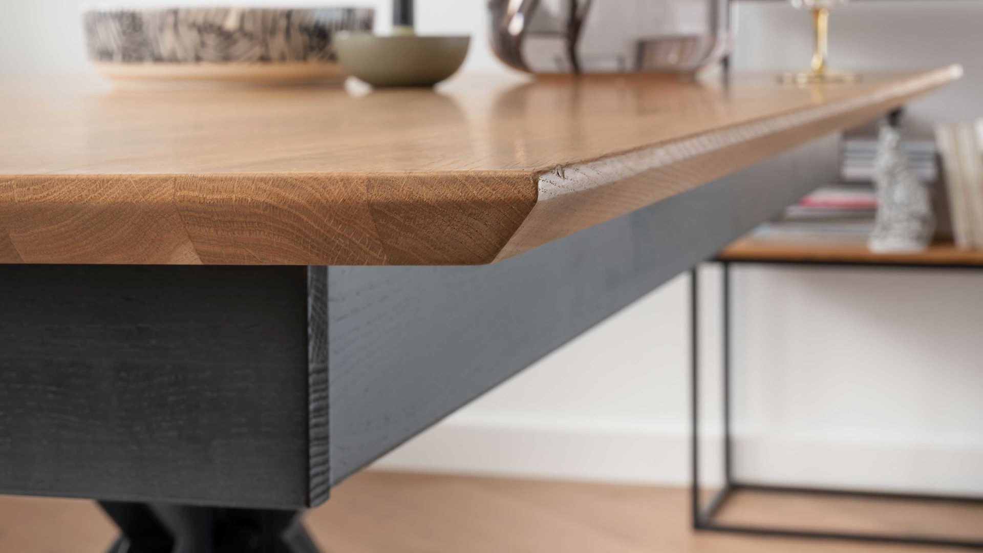 Mit seiner massiven geölten Wildeiche Tischplatte und dem schwarzen Metallgestell verleiht er jedem Raum einen modernen und stilvollen Touch. Die Tischplatte ist mit einer Schweizer Kante versehen, die nach unten abgeschrägt ist. Dieses Detail verleiht dem Tisch eine besondere Note und sorgt für einen angenehmen optischen Effekt.