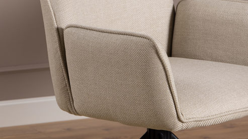 die Sitzschale mit Armlehnen hat eine Drehfunktion - zum Aufstehen einfach vom Tisch wegdrehen