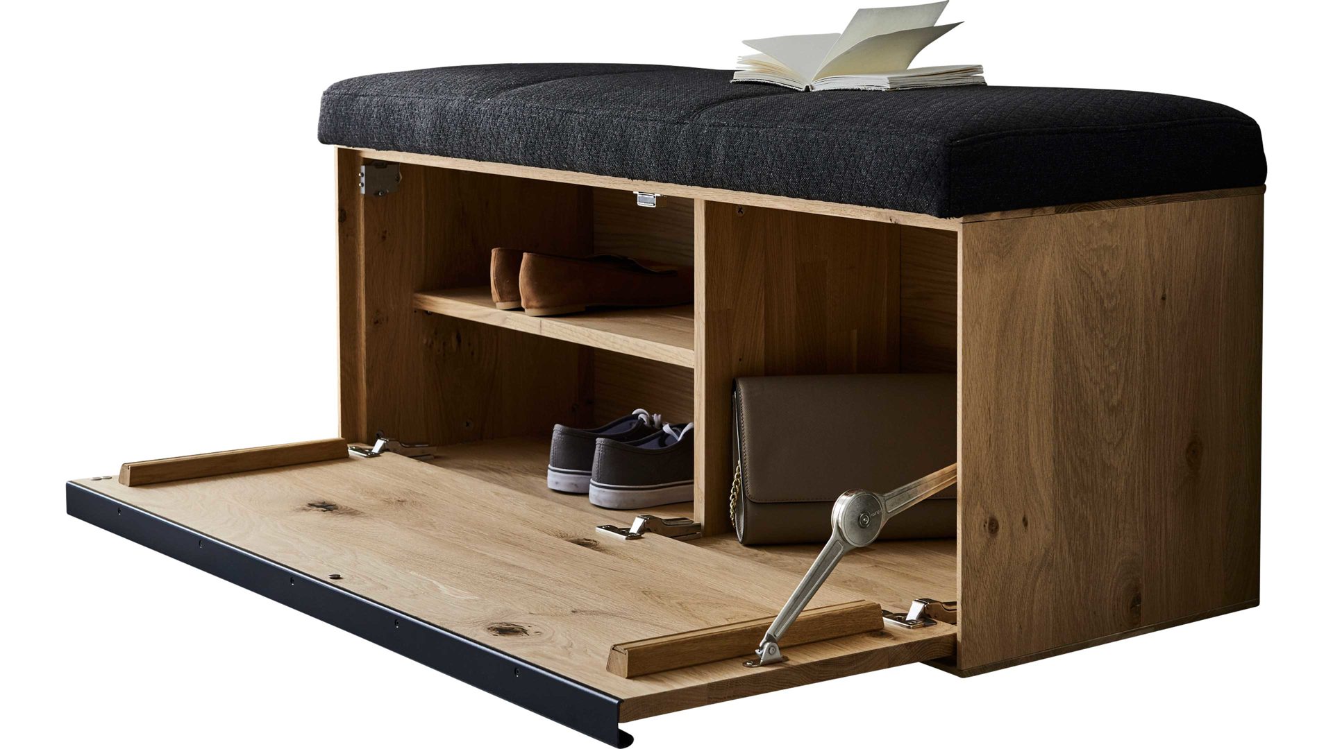 Die Dielenbank beherbergt zwei Holztüren. Innen befinden sich zwei Fachböden für insgesamt vier Fächer. Zudem kommt die Bank mit einem Sitzkissen daher, das mit stahlgrauem Stoff bezogen und mit Schaumstoff gefüllt ist. Die Maße der Garderobenbank belaufen sich auf ca. 84 x 53 x 38 cm (BxHxT).