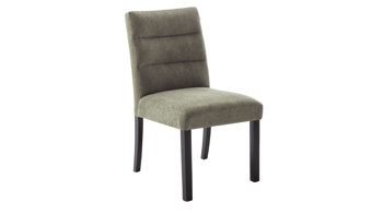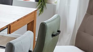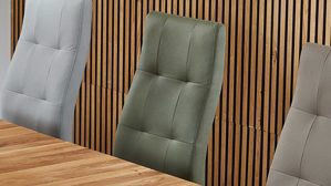 oöivgrüner Stoffbezug in Lederoptik, kombiniert mit mattschwarz lackiertem Metall