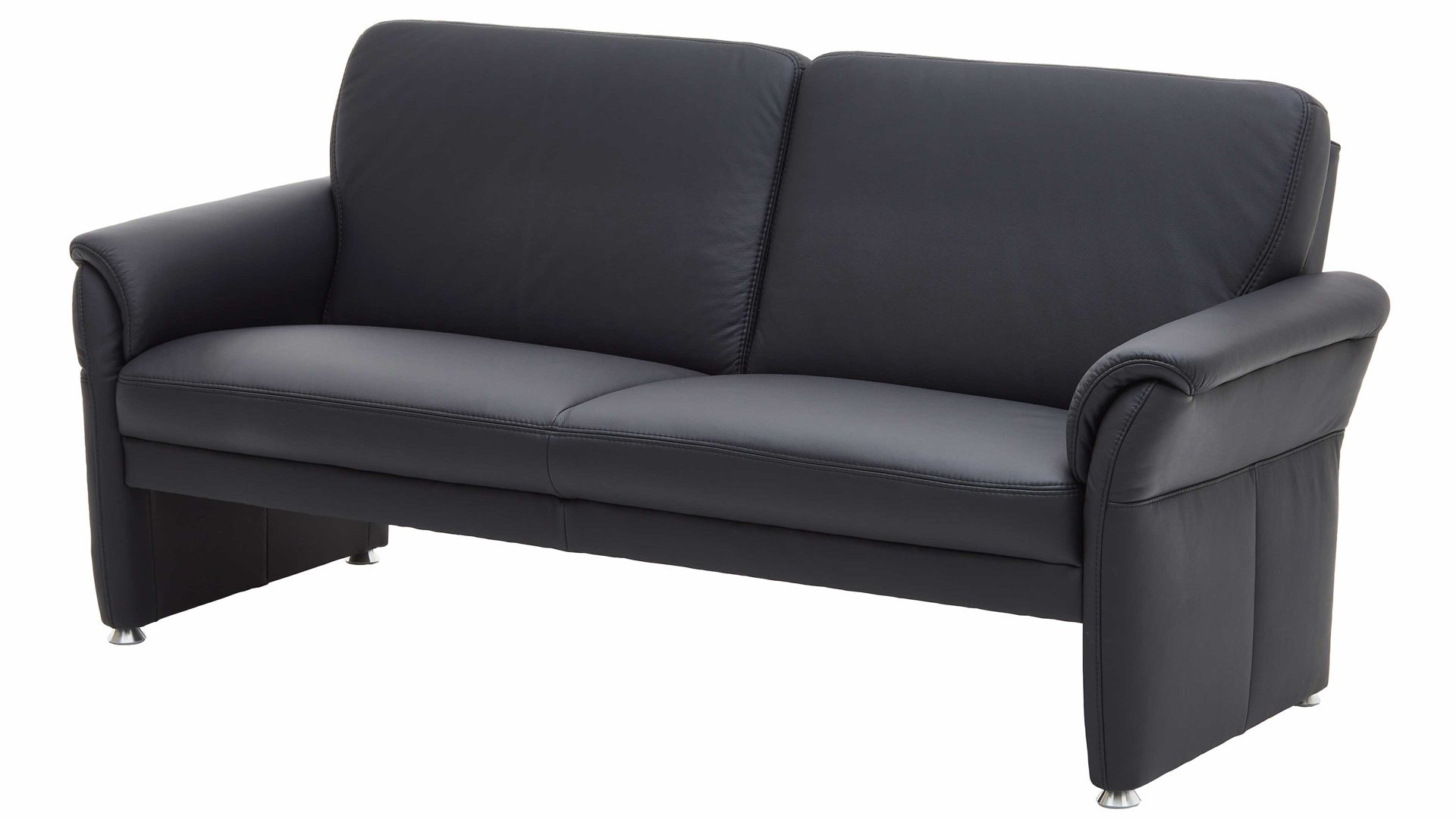 Mit den stabilen Aluminiumfüßen und dem klassisch-schwarzen Lederbezug strahlt dieser Dreisitzer moderne Eleganz aus. Die Materialien und Farben harmonieren hervorragend miteinander. Dank ihrer Zeitlosigkeit fügen sie sich in verschiedene Einrichtungskonzepte absolut stimmig ein. Die Maße der Ledercouch belaufen sich auf ca. 185 x 90 x 85 cm (LxHxT), bei einer Sitzhöhe von ca. 46 cm und einer Sitztiefe von ca. 53 cm.