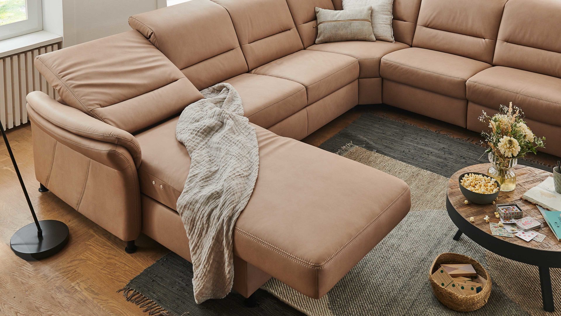 • Die Abbildung zeigt ein Wohnbeispiel, welches auch Dekoration sowie separat erhältliches Zubehör enthält. Im Lieferumfang enthalten ist eine motorische Relaxfunktion ohne Kopfteilverstellung.