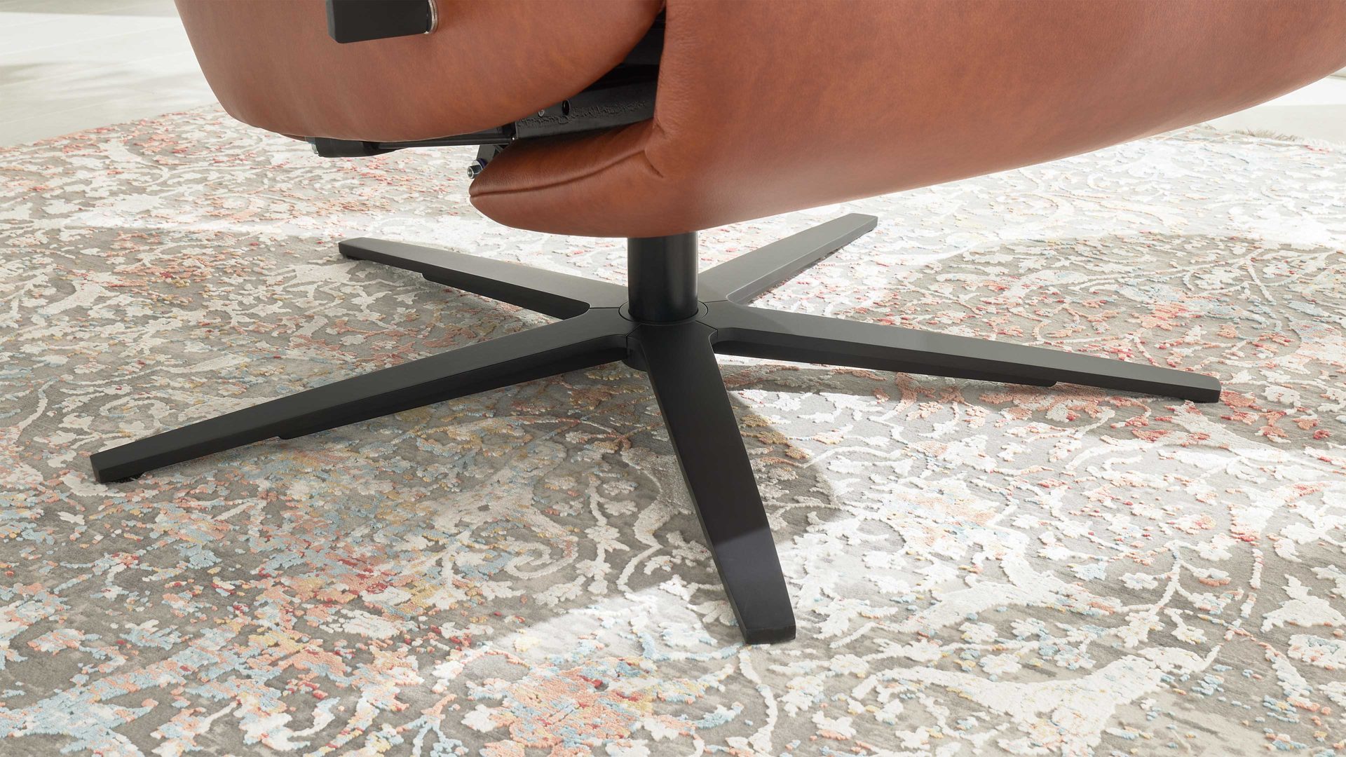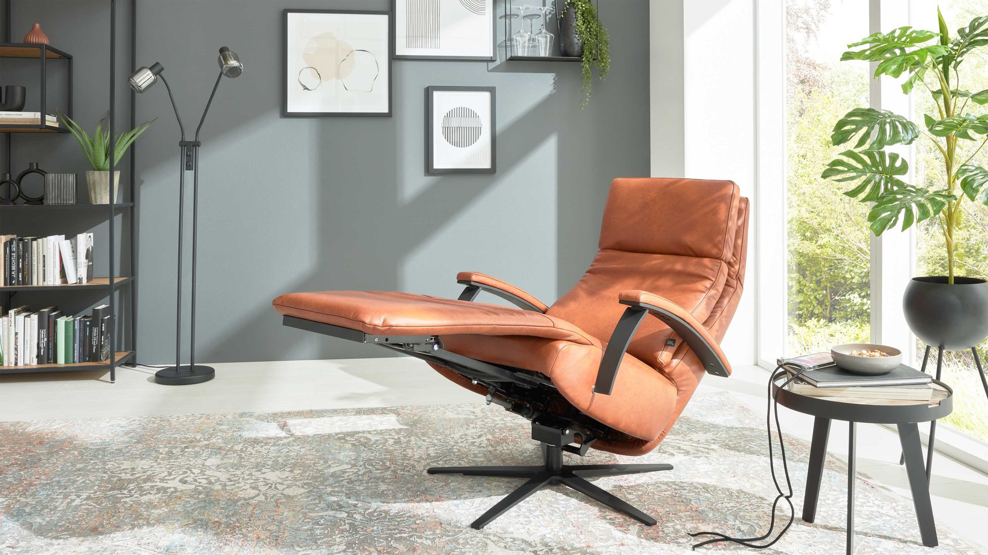 Der Relaxsessel mit manueller Relaxfunktion aus der Interliving Sessel Serie 4541 vereint edles Design mit hochwertigem Sitzkomfort. Der cognacfarbene LongLife-Lederbezug mit feiner Struktur in eleganter 2-Ton-Optik verleiht dem Sessel eine warme, luxuriöse Ausstrahlung. Der mattschwarze Metall-Sternfuß sorgt für moderne Leichtigkeit und Stabilität. Der Sessel wird in der Ergonomiegröße Small gefertigt und verfügt über eine vollgepolsterte Armlehne (nicht wie abgebildet in Kombination mit Metall) für ein besonders harmonisches Gesamtbild.