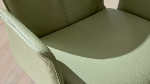 Der Armlehnstuhl aus der Interliving Esszimmer Serie 5115 verbindet modernen Komfort mit einem entspannten, wohnlichen Look. Der jadefarbene Lederbezug wirkt warm und einladend, während das umbraugrau pulverbeschichtete Metall-Vierfußgestell für Stabilität und einen klaren, modernen Akzent sorgt.