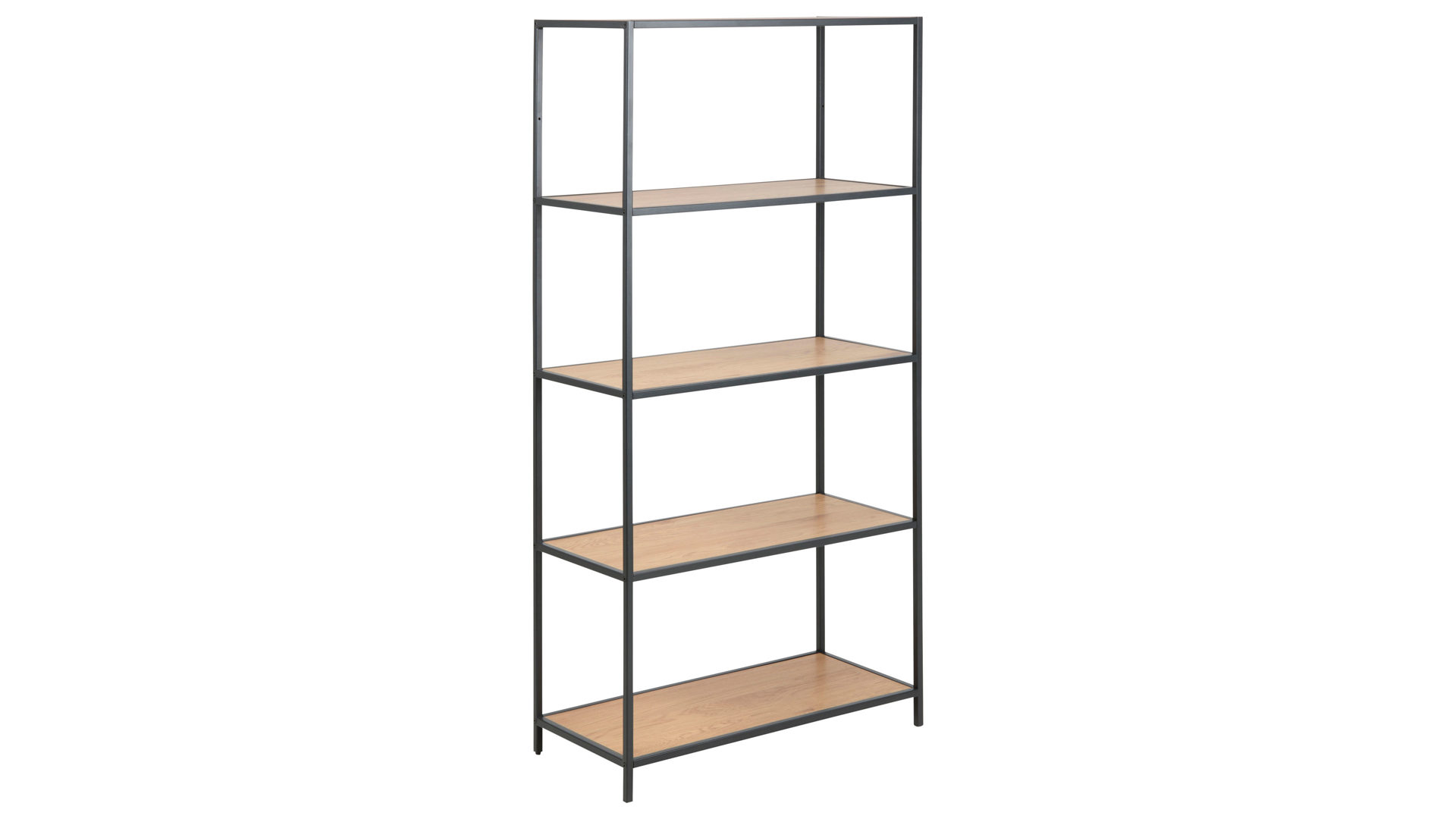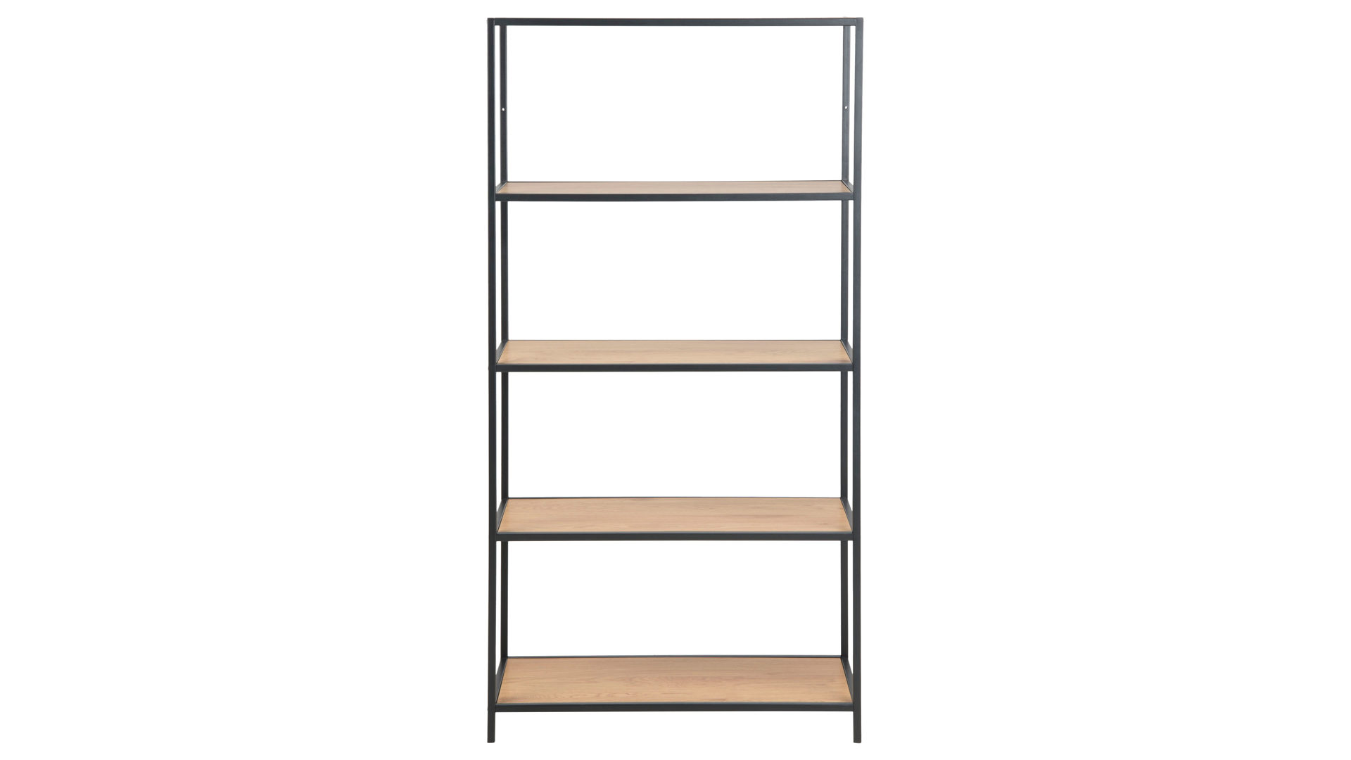 Das schwarz pulverbeschichtete Stahlgestell mit rauer Oberfläche gibt dem Regal ein zeitgemäßes Finish und macht es robust und widerstandsfähig. Mit Maßen von ca. 77 x 150 x 35 cm (BxHxT) bietet Ihnen das Regal mit vier großzügigen Fächern genug Stauraum für alles Wichtige in Ihrem Zuhause.