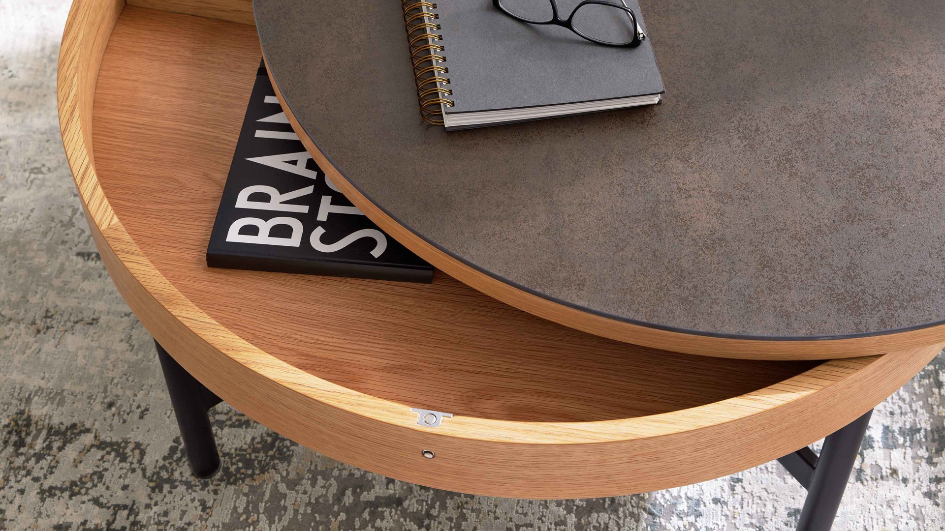 Die 3 mm starke Keramikplatte, fest auf Glas verklebt, macht den Tisch robust, pflegeleicht und hitzebeständig – ideal für den täglichen Gebrauch. Ein besonderes Detail ist die schwenkbare Tischplatte, unter der sich ein versteckter Stauraum verbirgt. Dort finden kleine Alltagsgegenstände wie Notizbücher, Teelichter oder Zeitschriften ihren Platz – praktisch griffbereit, aber ordentlich verstaut. Mit einem Durchmesser von ca. 44 cm und einer Höhe von ca. 52 cm ist der Beistelltisch die perfekte Ergänzung zu modernen Sofalandschaften oder als stilvolles Einzelstück in jedem Raum.