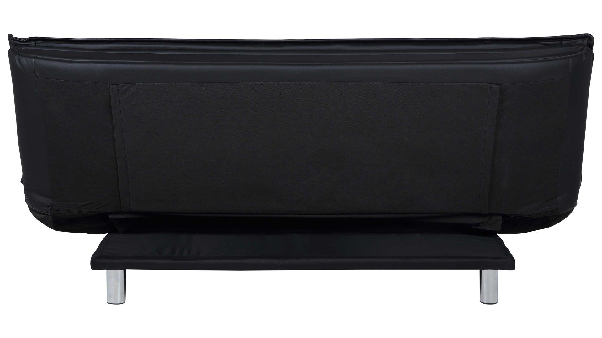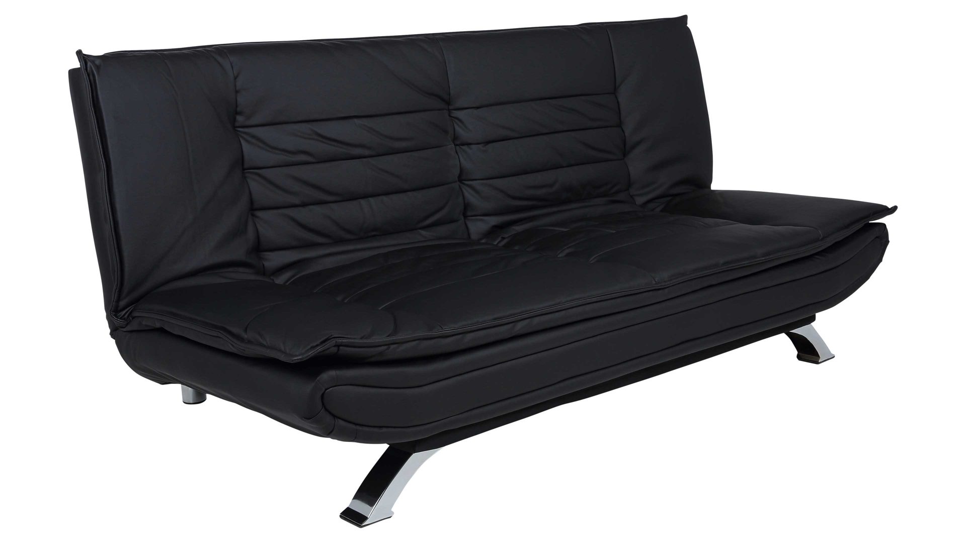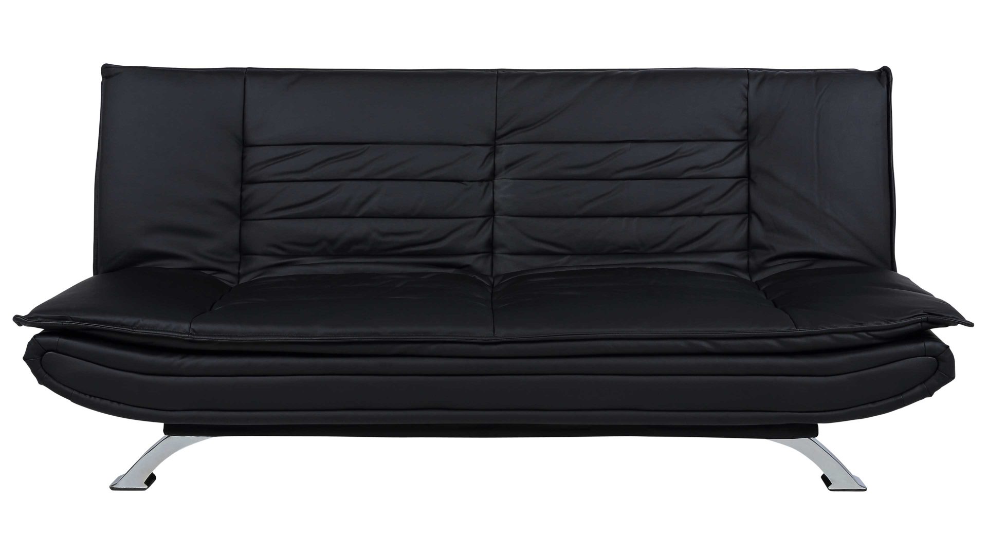 Das Schlafsofa Faith beeindruckt mit seinem modernen, eleganten Design sowie der Funktionalität, die es zu einem vielseitigen Polstermöbel macht. Für die nötige Standstabilität sorgen verchromte Metallfüße. Der schwarze Kunstlederbezug wirkt besonders edel und fühlt sich zudem sehr angenehm an. Einen gelungenen Akzent setzt die Quersteppung der Sitz- und Rückenfläche. Der Rücken der Couch ist mit schwarzem Nesselstoff bezogen.