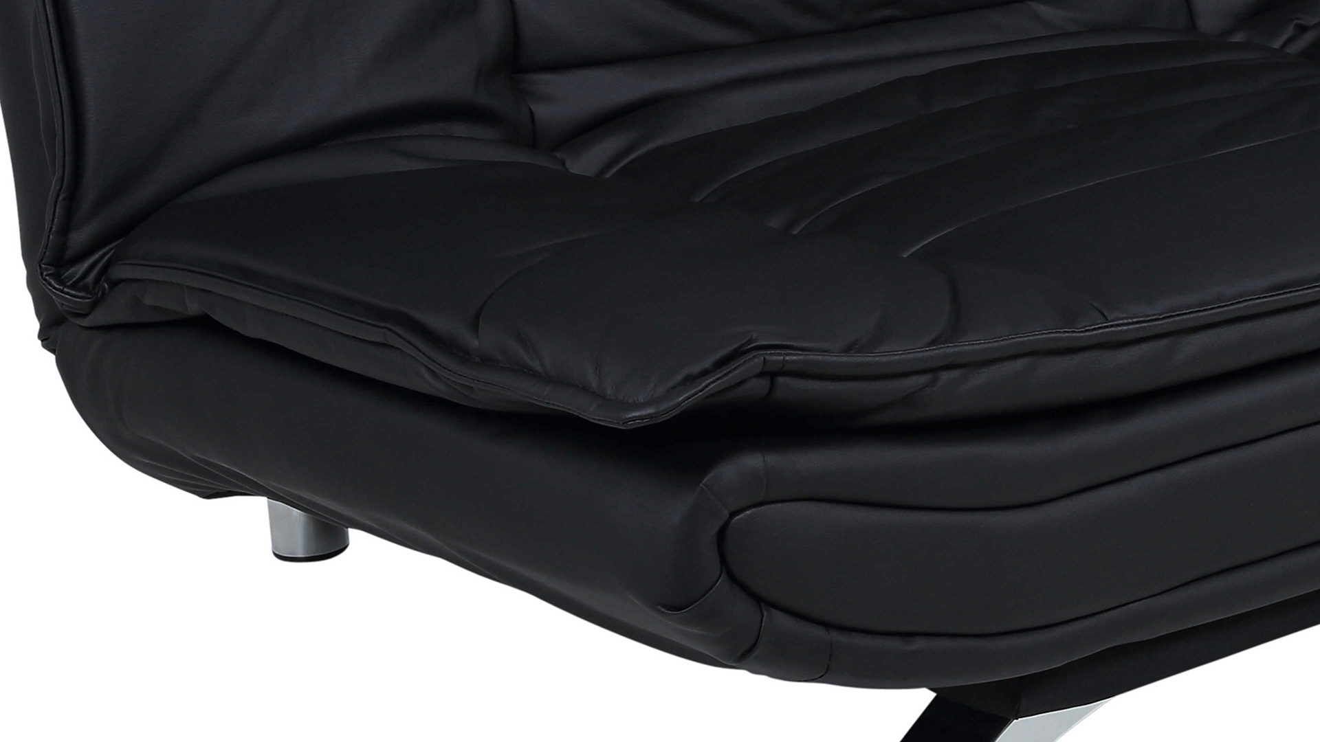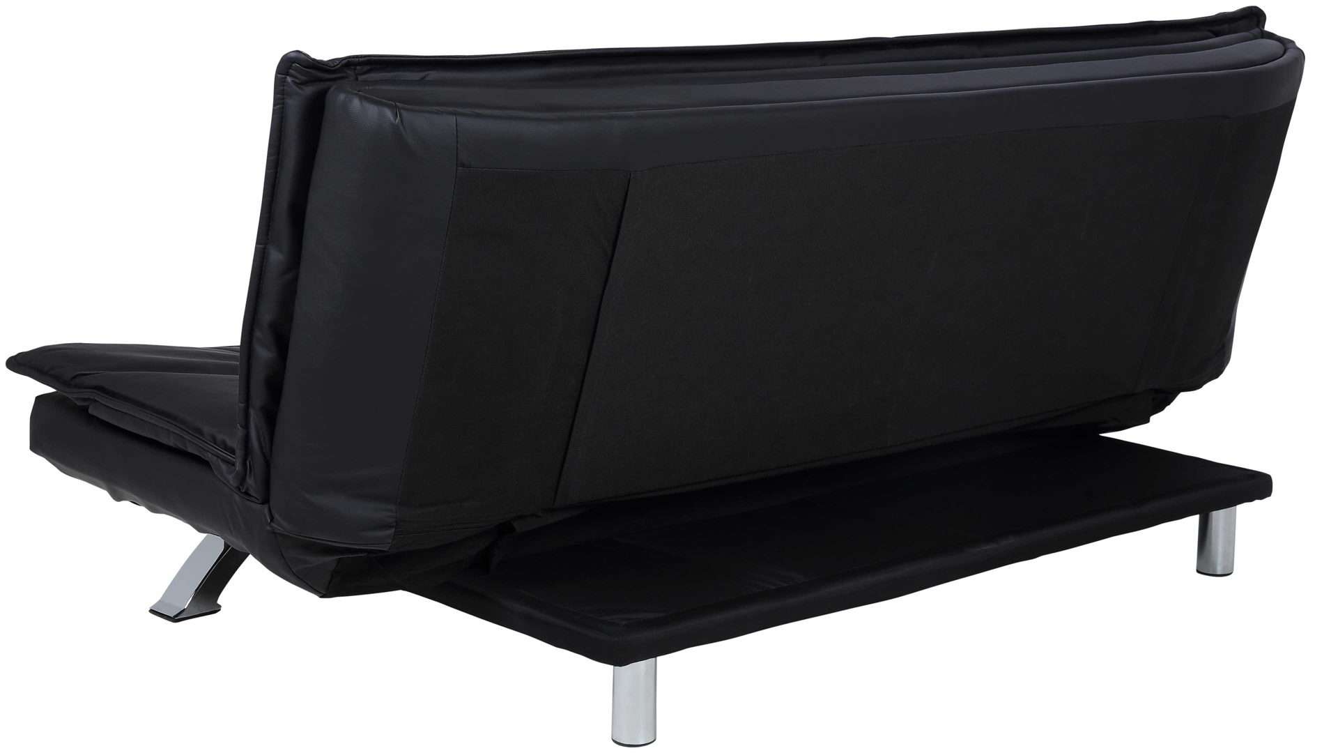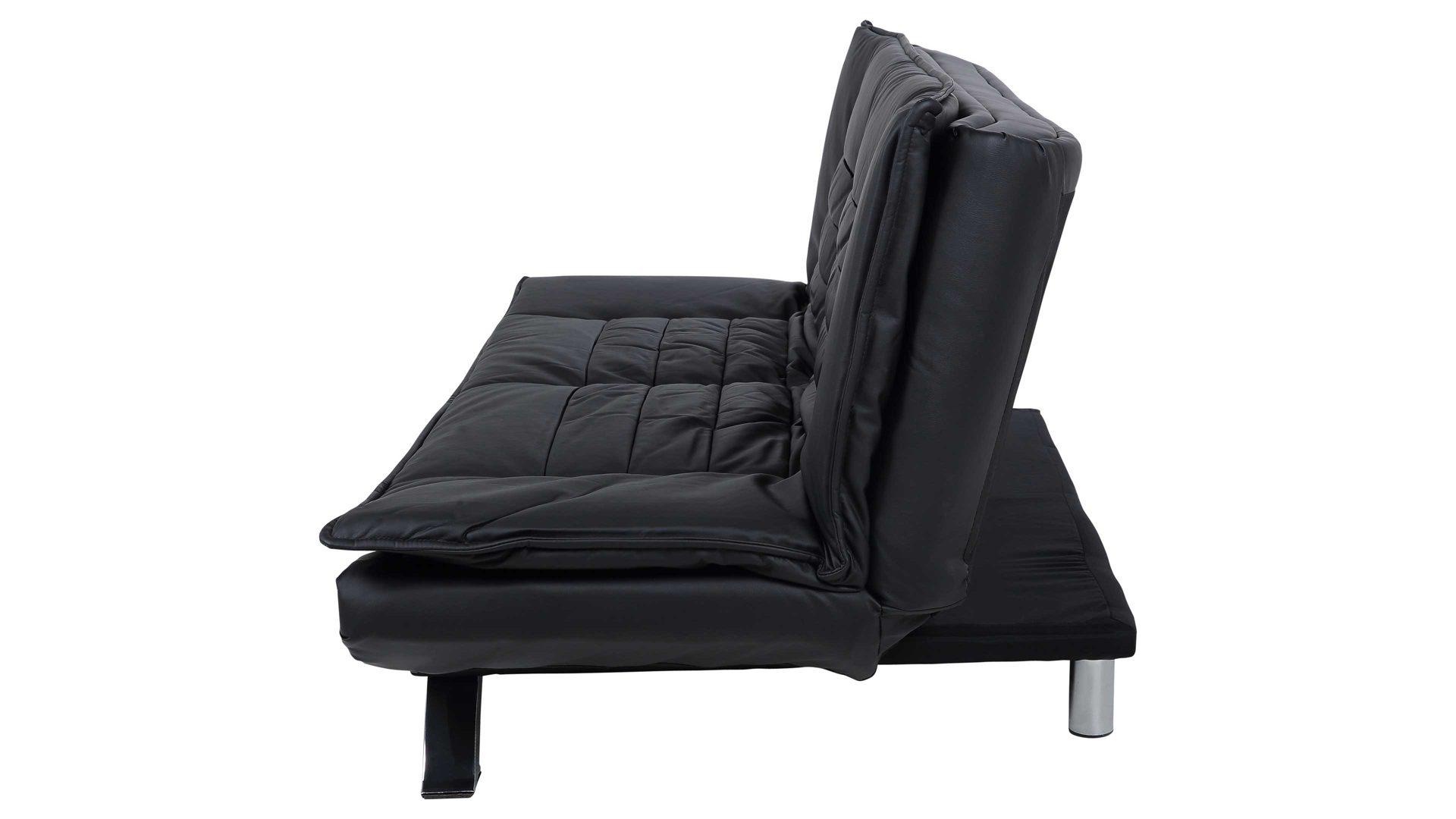 Das Schlafsofa Faith beeindruckt mit seinem modernen, eleganten Design sowie der Funktionalität, die es zu einem vielseitigen Polstermöbel macht. Für die nötige Standstabilität sorgen verchromte Metallfüße. Der schwarze Kunstlederbezug wirkt besonders edel und fühlt sich zudem sehr angenehm an. Einen gelungenen Akzent setzt die Quersteppung der Sitz- und Rückenfläche. Der Rücken der Couch ist mit schwarzem Nesselstoff bezogen.