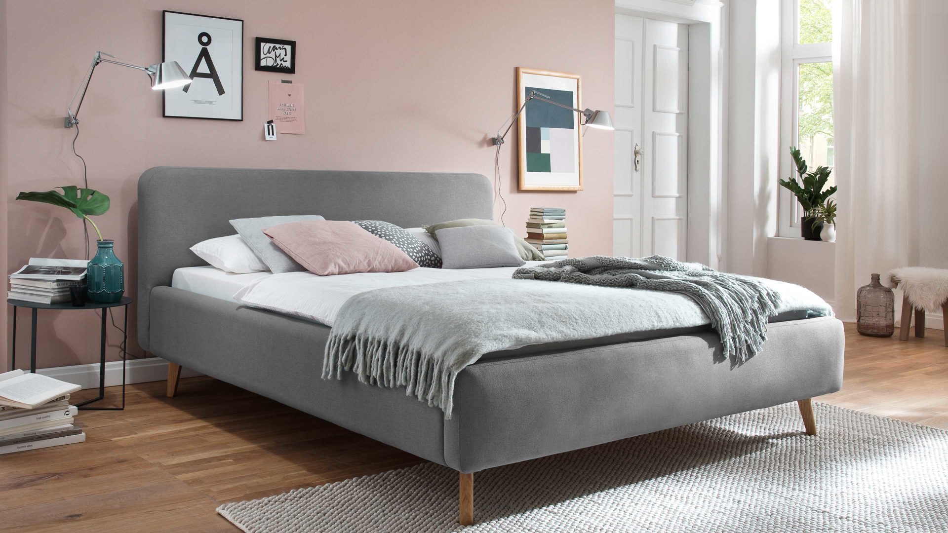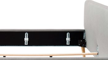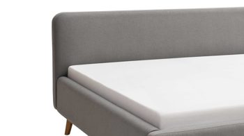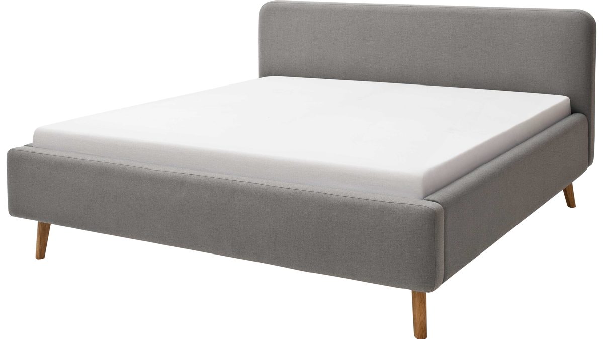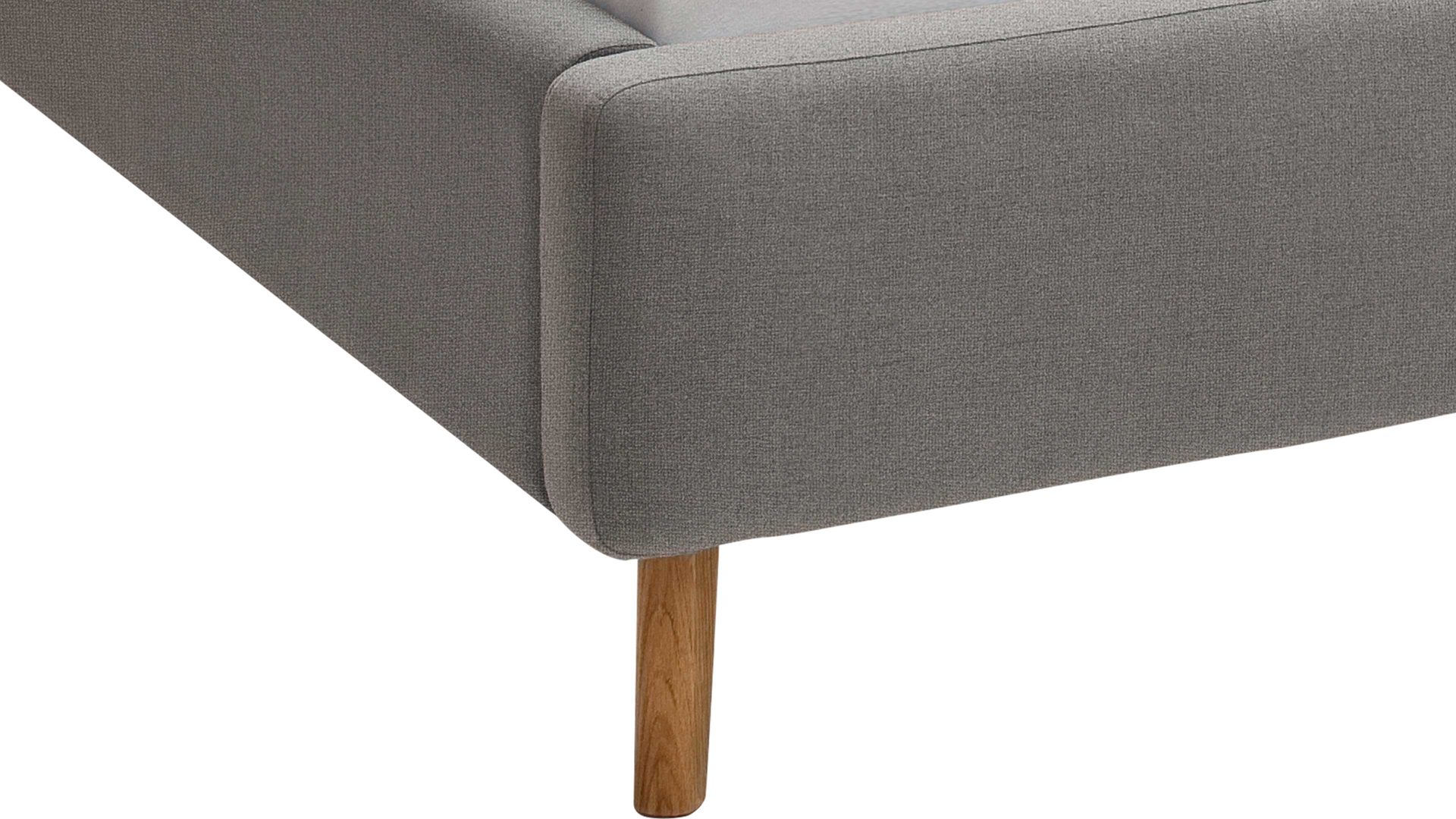 Mit den eichefarbenen Holzfüßen und dem hellgrauen Flachgewebebezug bringt das Polsterbettgestell Mattis modernes Flair in Ihr Schlafzimmer.