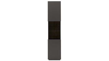 Die Vitrine aus der Interliving Wohnzimmer Serie 2030 vereint modernes Design mit praktischer Aufteilung – perfekt als stilvoller Glasschrank, Einzelvitrine oder eleganter Solitär im Wohn- oder Esszimmer. Die wolframgrauen Lackoberflächen verleihen dem Möbelstück eine ruhige, edle Ausstrahlung. Für spannende Akzente sorgen graues Parsolglas, eine sichtbare Rückwand mit Spaltholz auf schwarzer MDF, ein Holzsockel sowie ein Griff aus schwarz lackiertem Metall mit feiner Struktur. So entsteht ein harmonisches Gesamtbild mit einem Hauch von Exklusivität.