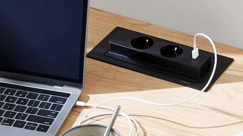 Mit kompakten Maßen von ca. 23 x 10,5 cm (L/BxT) benötigt die Backflip nur wenig Platz und lässt sich harmonisch in die Arbeitsplatte deines Schreibtischs integrieren. Ein sanfter Fingerdruck genügt – und schon dreht sich die Steckdosenleiste elegant aus der Fläche heraus.