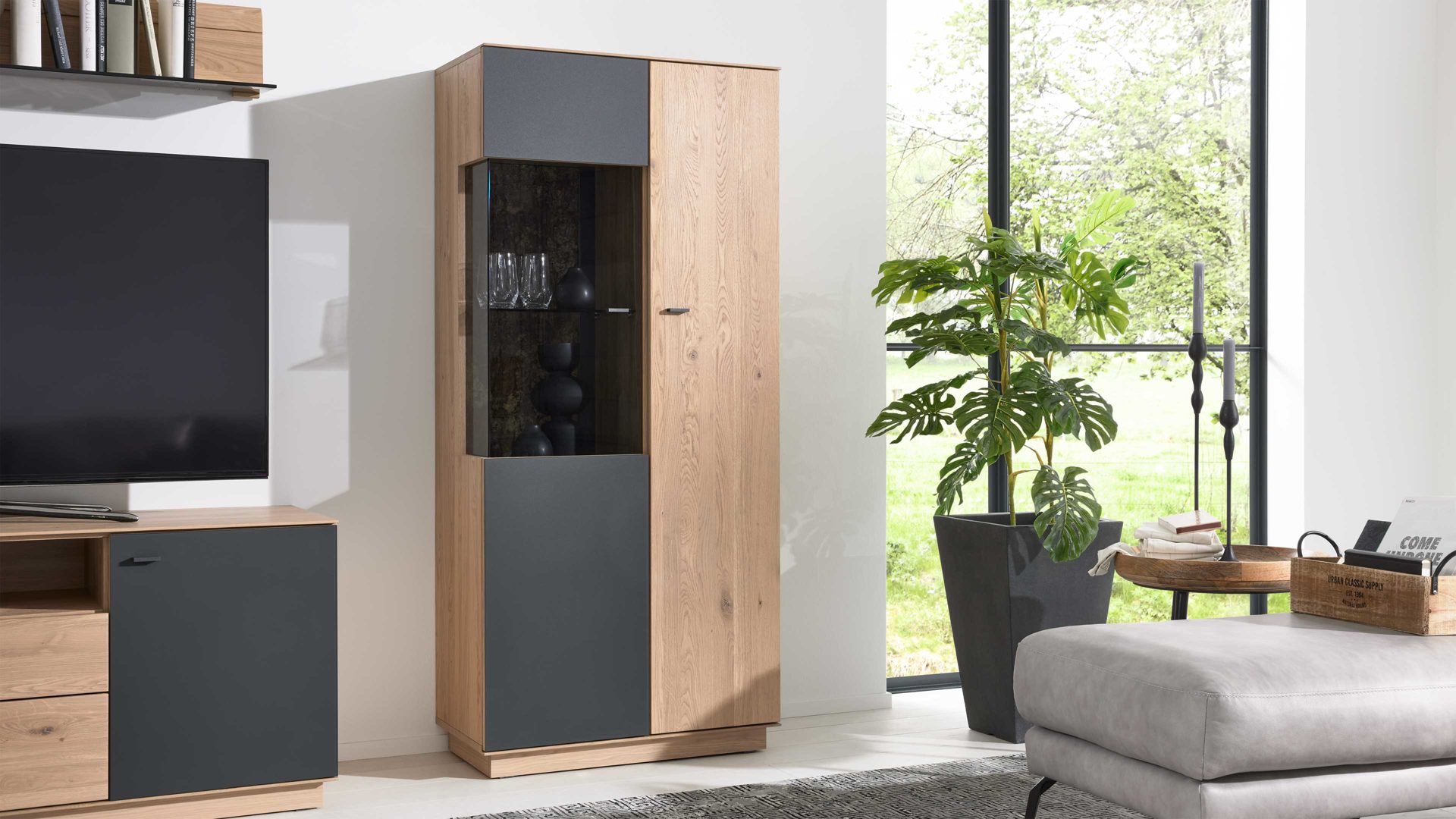 Die Oberflächen sind pflegeleicht, UV-beständig und kratzfest, was sie besonders alltagstauglich macht. Die Glastüren mit grau getöntem Floatglas verleihen dem Möbelstück eine elegante Leichtigkeit, während die klaren Glasböden für Transparenz und Struktur sorgen. Optional kannst du die Vitrine mit einer geschroppter Rückwand, zusätzlichen Frontplanken oder einer LED-Beleuchtung ausstatten – für ein individuelles, atmosphärisches Wohnambiente.