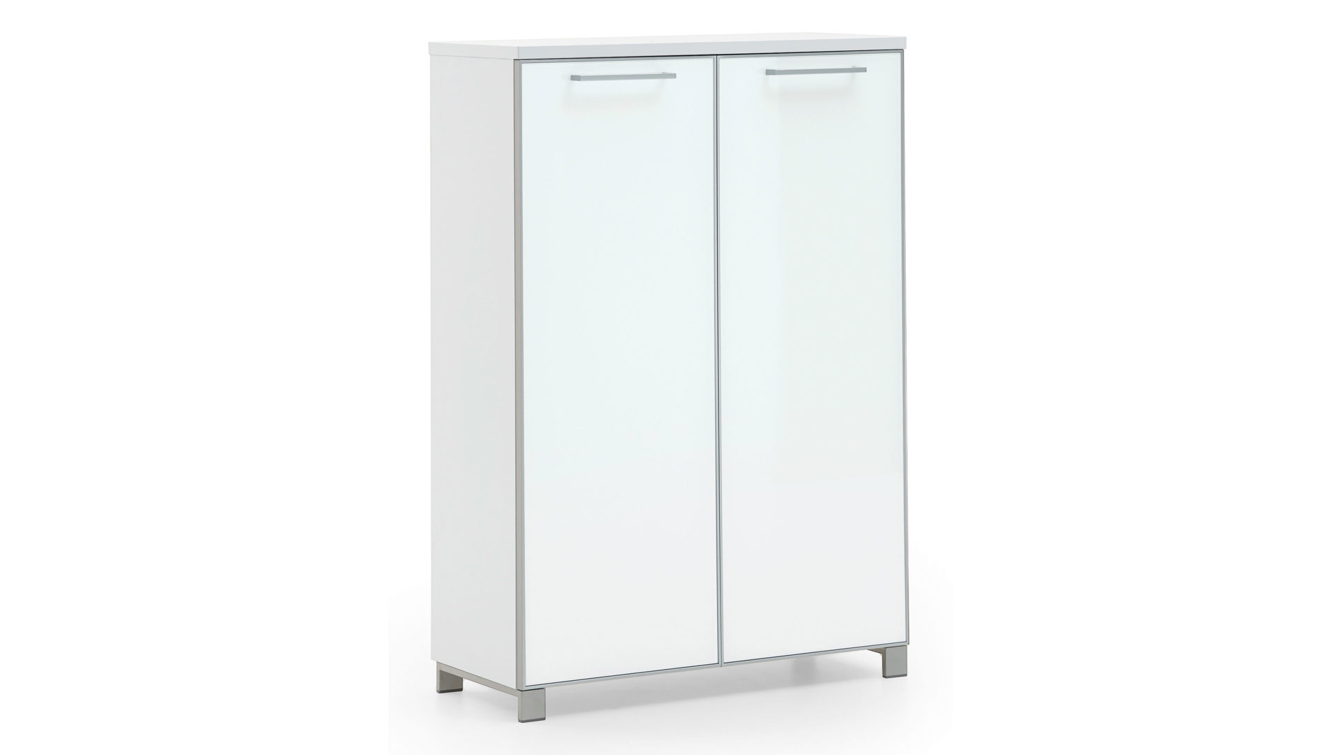 Der VOSS MÖBEL Schuhschrank Santina ist modern-elegant designt. Mit dem klassisch weiß lackierten Korpus und den optiweißen Glasfronten bringt er jede Menge Helligkeit in Ihren Flur. Edelstahlfarbene Griffe runden das noble Erscheinungsbild des optisch wie funktional ansprechenden Schuhkippers stilsicher ab.