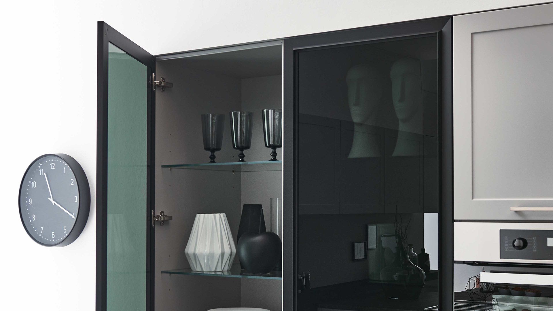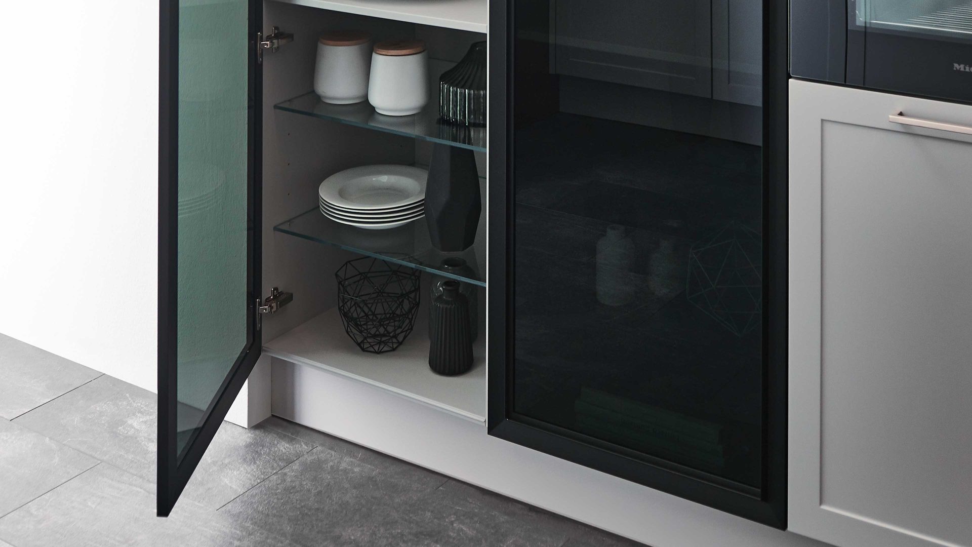 In den vielen Schrankelementen und Auszügen können Sie Geschirr, Besteck und sonstige Küchenutensilien aufbewahren sowie Lebensmittel lagern. Zu den Highlights der nolte Einbauküche Focus gehören neben der großen Kochinsel vor allem die Vorratsschränke mit Schwarzglastüren sowie die grifflosen Hängeschränke mit push-to-open-Funktion.