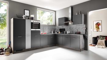 Die Stellfläche beziehungsweise das Schenkelmaß der Planküche beläuft sich auf ca. 335 x 246 cm (BxL, von links nach rechts). In den verschiedenen Schränken und Auszügen haben Sie jede Menge Stauraum für die wichtigsten Küchenutensilien.