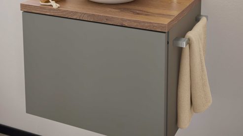 Setze auf helle Wandfarben und ergänze Accessoires in Schwarz oder Chrom, um die taupegrauen Fronten stilvoll zu betonen. Durch die flexible Montage des LED-Spiegels kannst du die Raumwirkung gezielt beeinflussen – vertikal für schmale Wände, horizontal für mehr optische Breite. In Kombination mit weiteren Möbeln der Interliving Bad Serie 3715 entsteht eine harmonische, platzsparende Badlösung mit moderner Ausstrahlung.