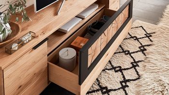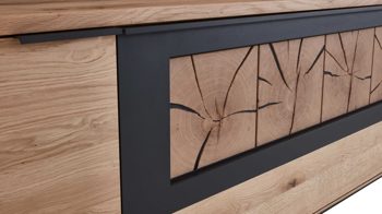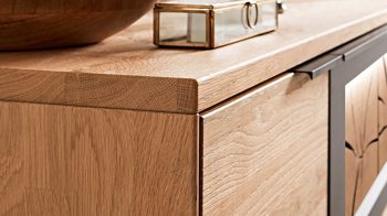 soft gebürstete Wildeiche, kombiniert mit carbonfarbenen Lackoberflächen und massiven Hirnholz-Akzenten