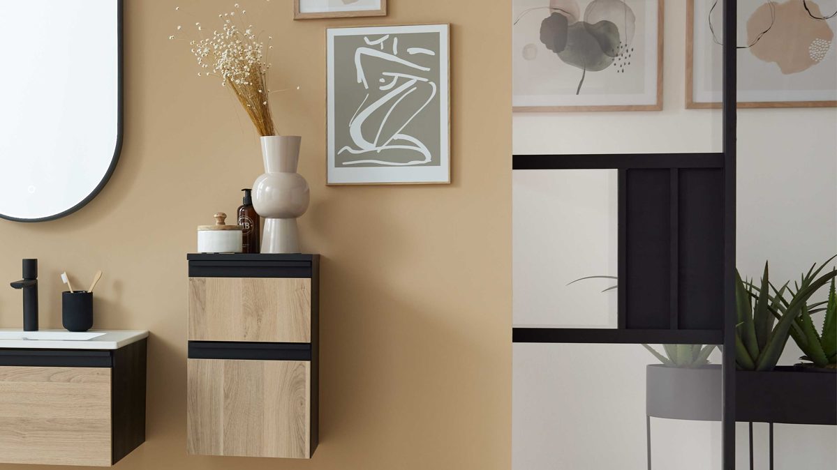 Der Hängeschrank überzeugt mit einer Metallschublade und einem Metallauszug, beide ausgestattet mit Premium-Dämpfungstechnik für besonders leises und sanftes Schließen. Die elegante schwarze Ablageplatte setzt einen modernen Akzent und unterstreicht das hochwertige Erscheinungsbild – perfekt, um Pflegeprodukte, Deko oder Accessoires stilvoll in Szene zu setzen.