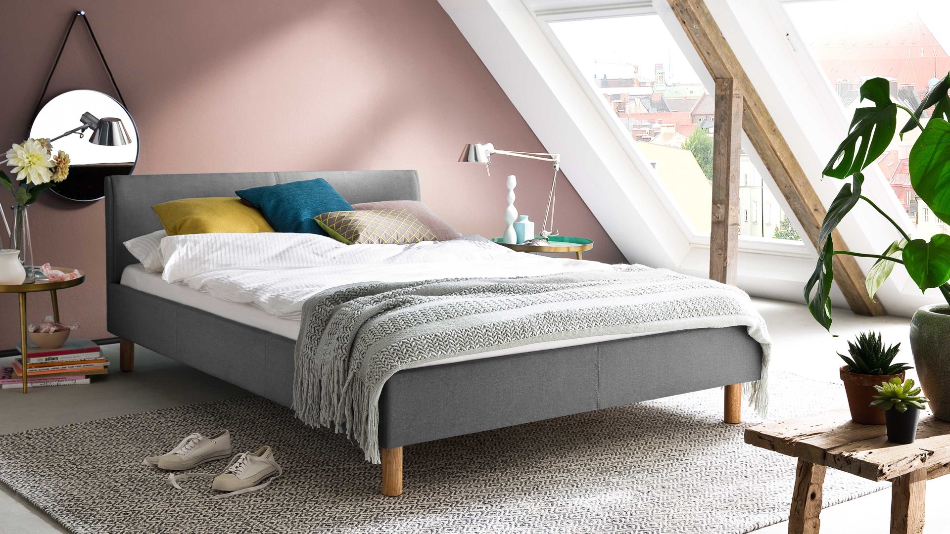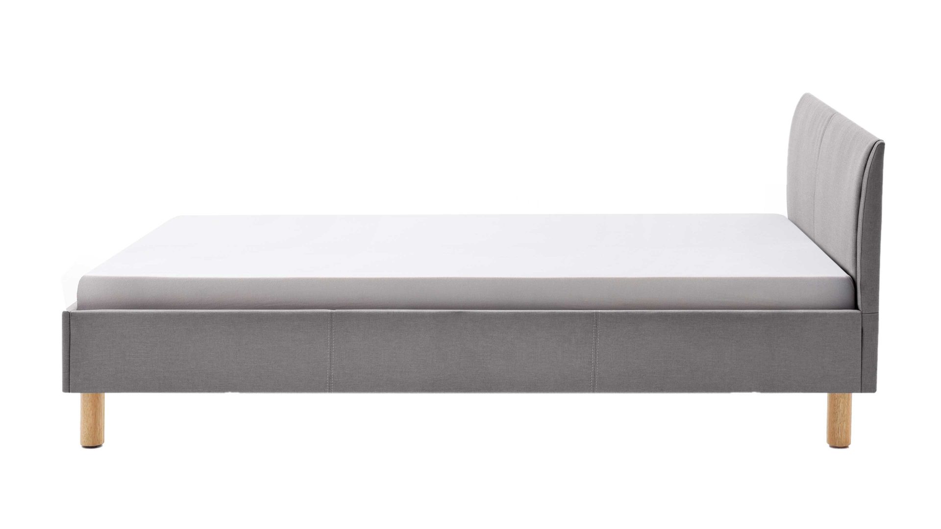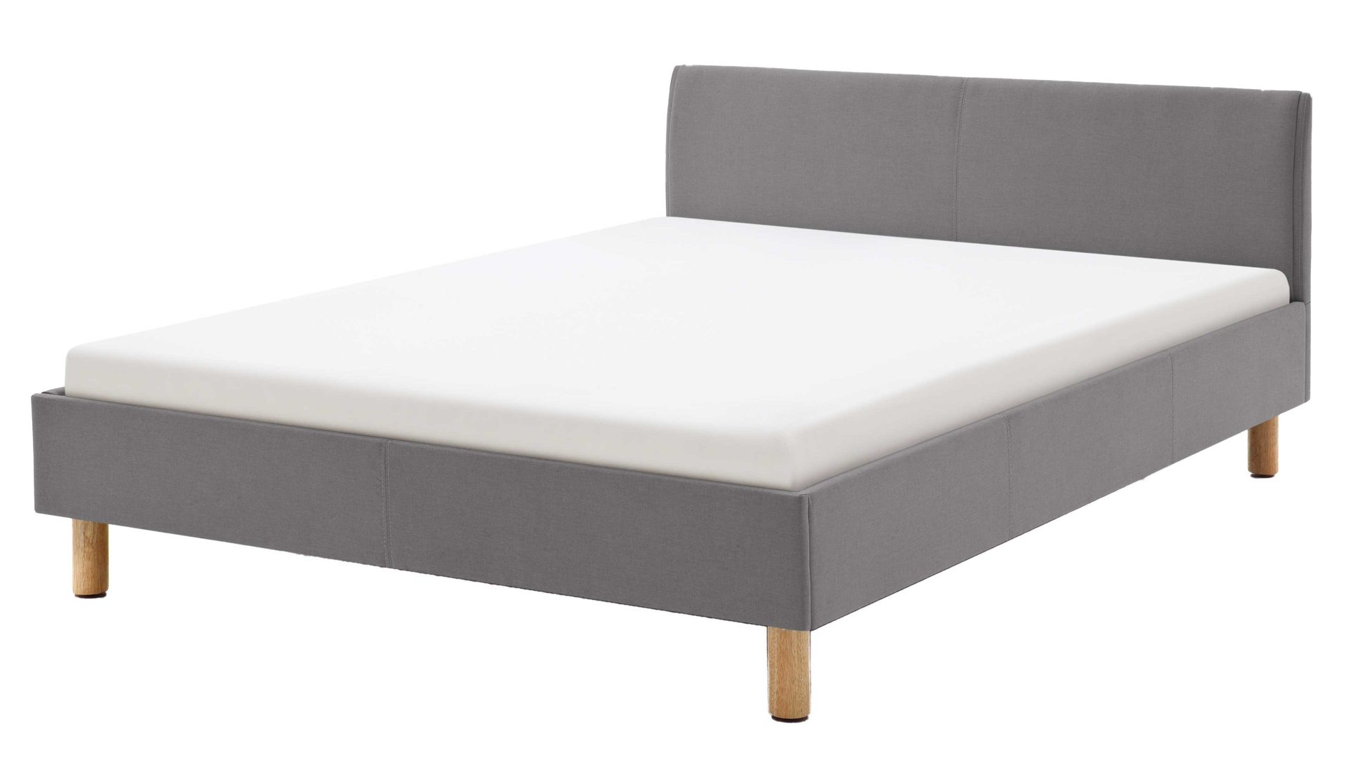 Mit dem edlen hellgrauen Stoffbezug und den eichefarbenen Holzfüßen strahlt das Polsterbettgestell Lena klassische Eleganz mit einer Prise Natürlichkeit aus. Sowohl die Bettseiten als auch das bequeme Polsterkopfteil sind glatt bezogen, was den gemütlichen Charakter des Bettes unterstreicht. Das angenehm weiche Kopfteil ist beispielsweise beim Lesen oder Fernsehen als praktische Rückenlehne nutzbar.
