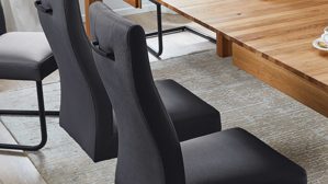 dunkelgrauer Stoffbezug in Lederoptik, kombiniert mit mattschwarz lackiertem Metall